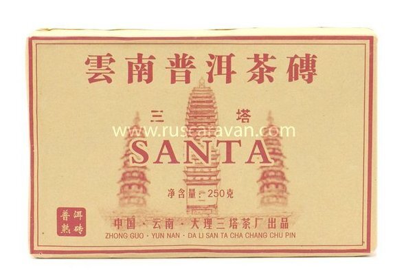 Пуэр в форме кирпича в линейке «Саньта» - продолжение древней традиции производства китайского чая, так как запрессовывали в такую форму чай китайцы уже не одну сотню лет. Популярная форма плитки с изображением 3 башен (буддийских па́год) – символом города Дали в Юньнани, где началась история бренда..