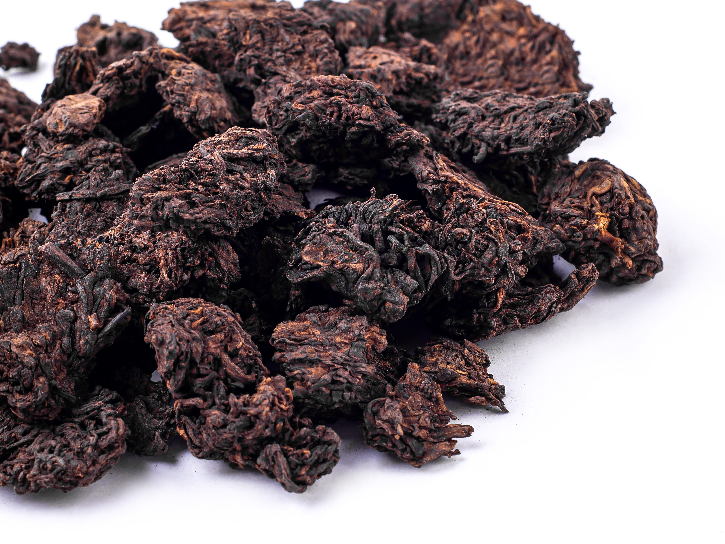 Один из самых необычных продуктов – это Чайные Головы, или Ча Тоу. Во время процесса водуй (влажное скирдование) остаются небольшие слипшиеся массы чая пуэр, которые не были разделены и получили название «чайные головы». Они нашли своего любителя, и уже много лет продаются вполне успешно на чайном рынке. Чайный завод «Цзинлун» продает их более полутора десятков лет. Так сказать «культовый продукт». СЫРЬЕ: Лао Ча Тоу (или Старые Чайные Головы) глубокой ферментации, среднего размера, бленд несортированных линцаньского и мэнхайского пуэров. Зрелые, темно-коричневого, почти черного цвета.