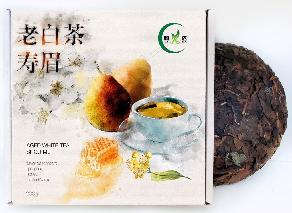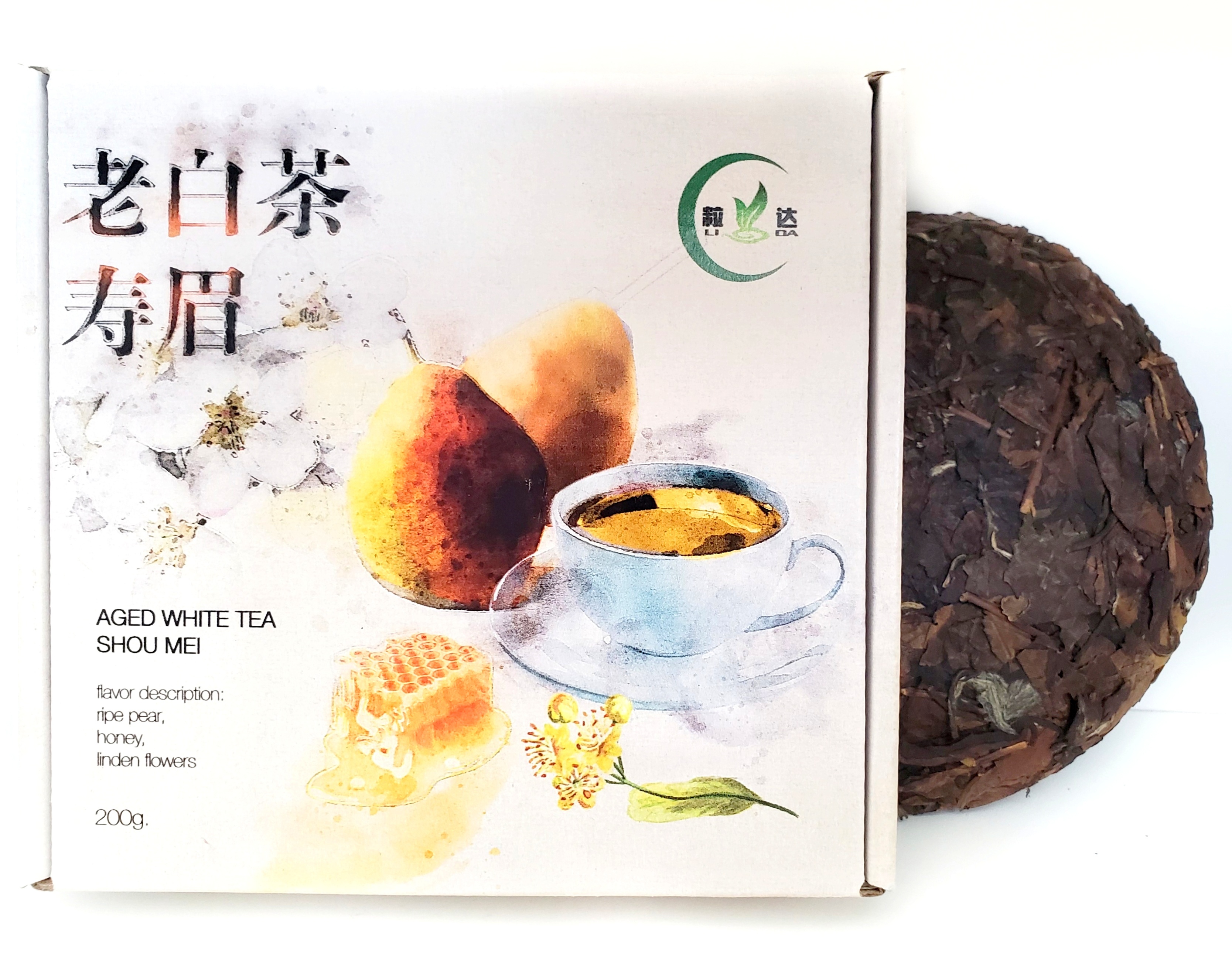 Выдержанный более 14 лет «Шоу Мэй» в форме блина, весом в 200 грамм в красивой подарочной коробке. В последние несколько лет выдержанный белый чай в Китае стал очень дорогим и популярным, поэтому Шоу Мэй Лао Бай Ча в подарочной упаковке сявляется настоящей находкой. < br>