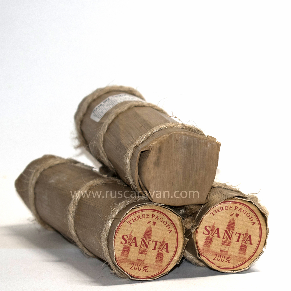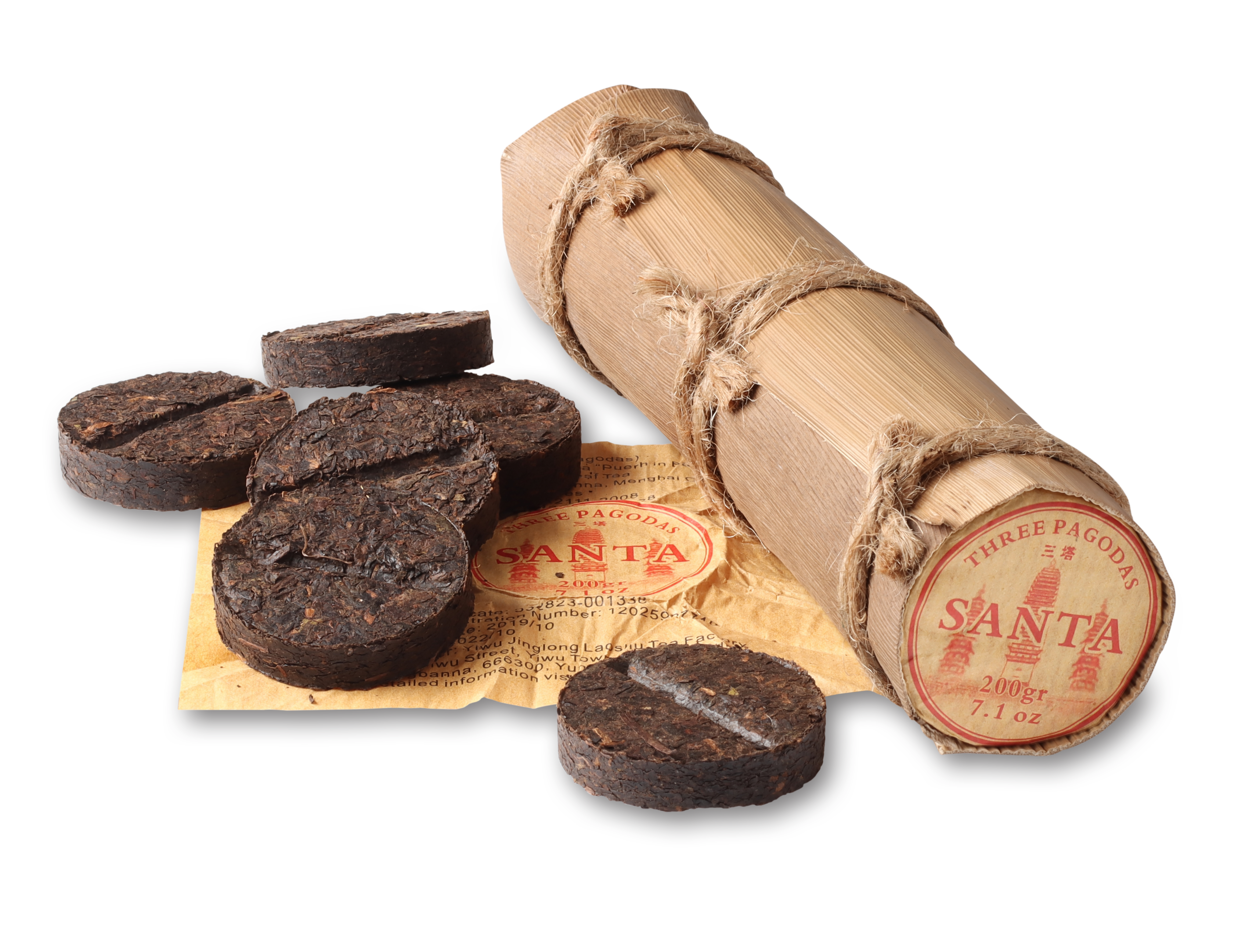 Пуэр, прессованный в «таблетки», с насечкой посередине для деления на 2 части, обернутые в бамбуковый лист. Отличается высоким уровнем кофеина- тот самый чай, который нужен для быстрого эффекта бодрости.