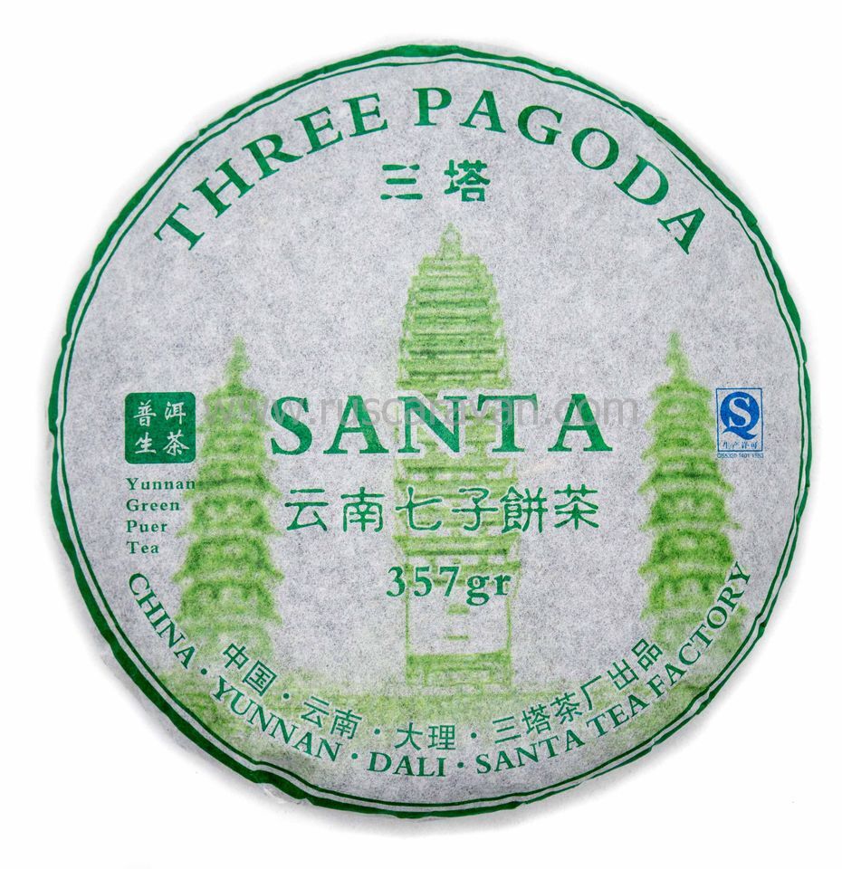 Прессованный зеленый пуэр, регион Юньнань. На обложке блинчика изображены знаменитые 3 буддийские башни (Пагоды) из города Дали в Юньнани, где началась история бренда. Сейчас линейка пуэров «Сань Та» (Три Пагоды), производится на чайном заводе Цзинлун.