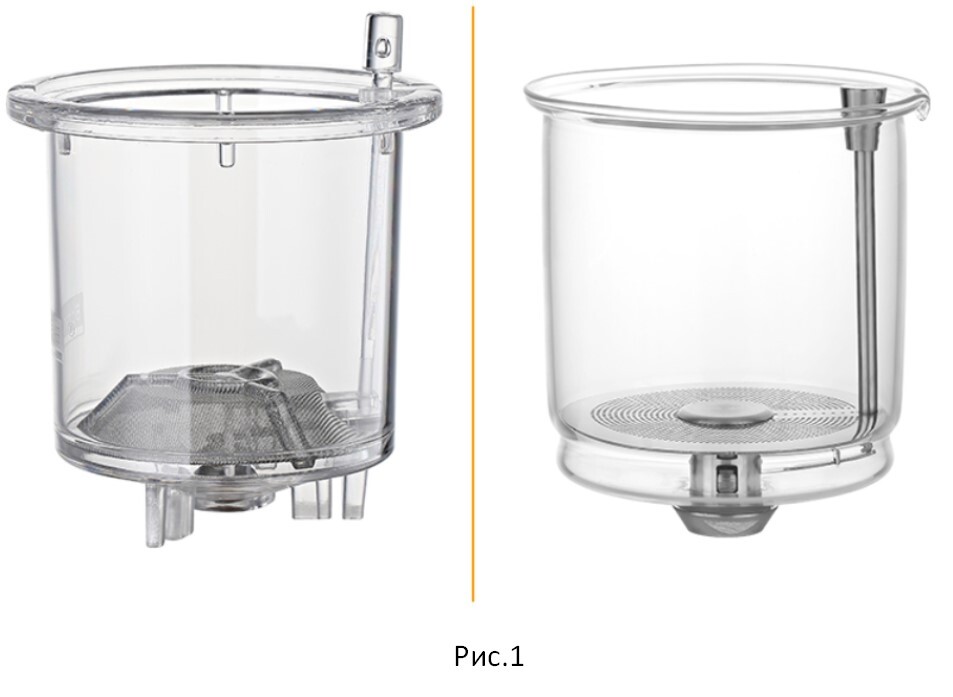 Рис.1. Сравнение колбы старого стиля (слева) и нового (справа). Стекло полностью заменило пластик.