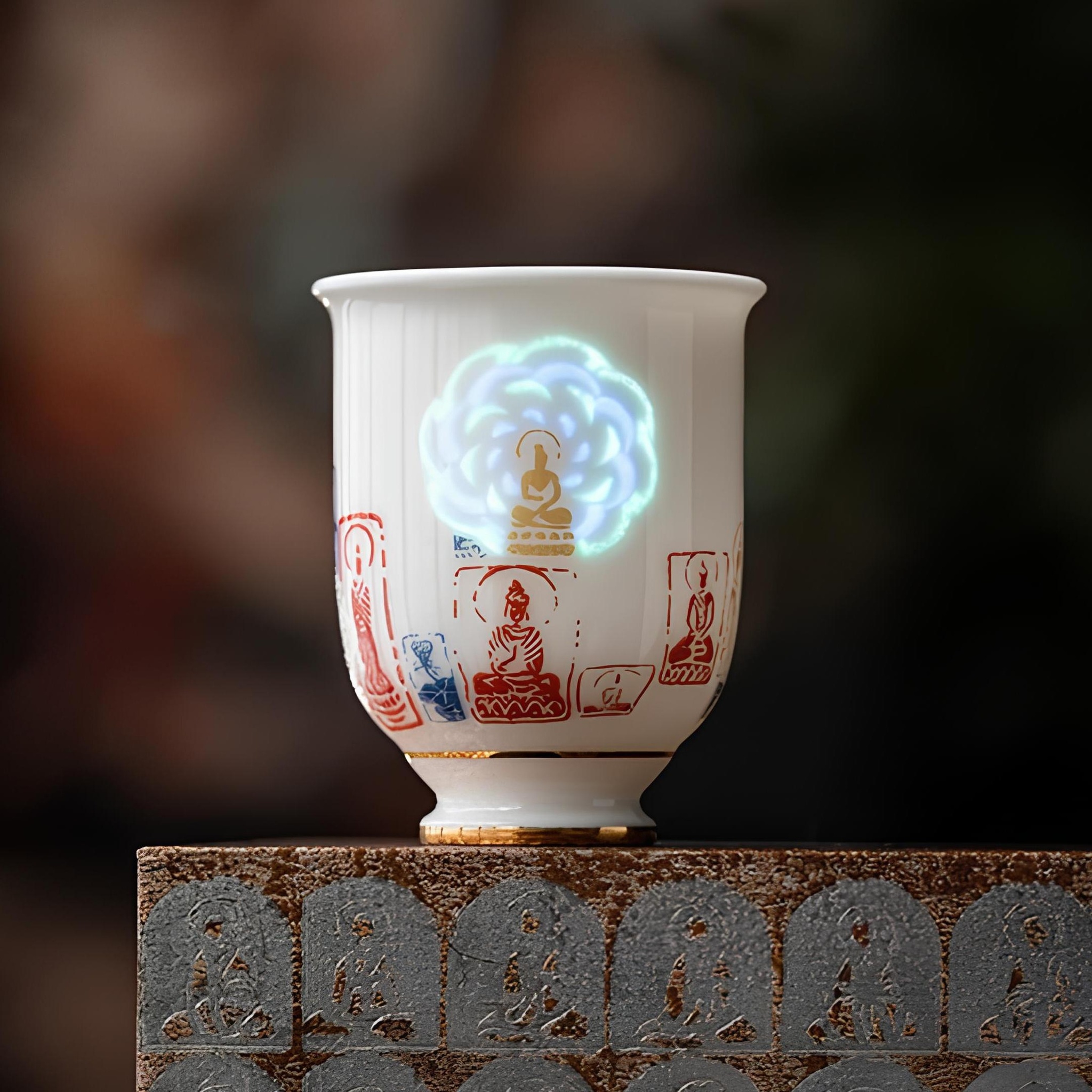 Эта пиала - эффектный аксессуар для вашего ассортимента. Эта стандартная по размеру гайвань изготовлена из качественного термостойкого фарфора. Ее ключевая особенность – изображение Будды с фотолюминесцентной глазурью, которое после "зарядки" дневным светом или УФ-лампой четко светится в темноте. Интенсивность и продолжительность свечения зависят от времени зарядки, создавая запоминающийся визуальный эффект в затемненном пространстве. В комплекте к пиале идет УФ фонарик.
