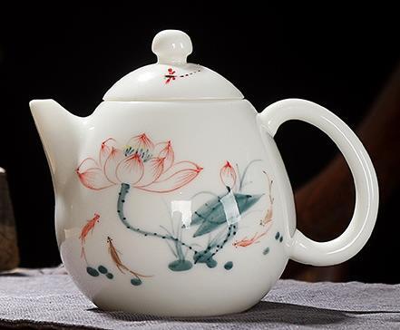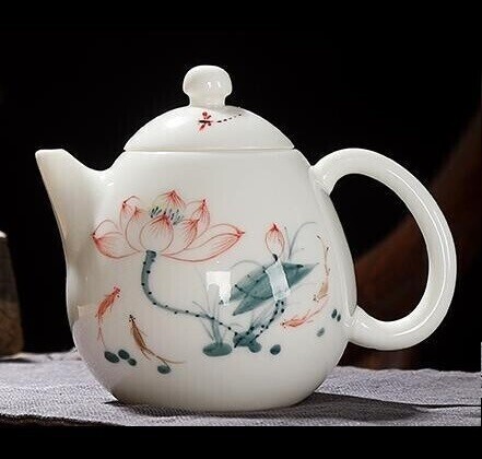 Чайник популярной формы Лун Дань (Яйцо Дракона) расписан вручную — детали рисунка могут оличаться один от другого и нет двух абсолютно одинаковых. Фарфор "Бараний Жир" — Тонкий глазурованный фарфор династии Мин, печи Дэхуа. Вид фарфора Янчжи Юйцы «Бараний жир» или «Белая яшма». Цветок лотоса — как символ чистоты, совершенства и всего прекрасного.