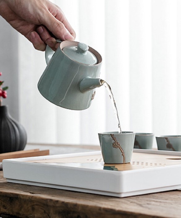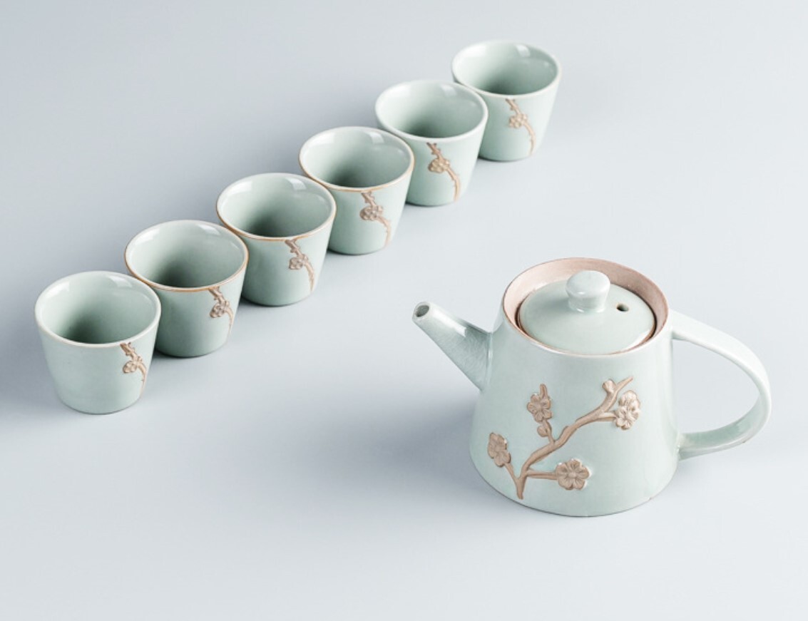 Чайный сервиз из керамики в цветной глазури Гэяо (селадон) с мотивом ветки Сакуры.