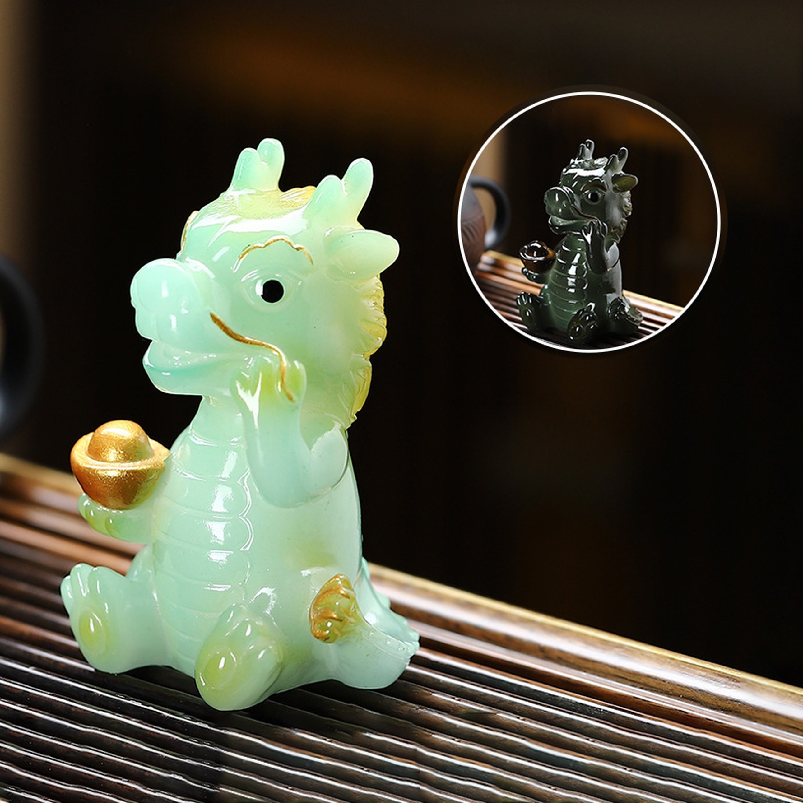 Дракон меняет цвет с темного на светло-зеленый (нефритовый). Монета Юаньбао становится золотой.