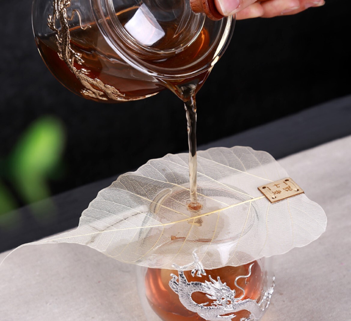 Это изящное и невероятно красивое сито сделано из натурального материала – настоящего листа дерева Туан – одного из видов липы, встречающейся в лесах на высотах 1200–2400 м в центральных китайских провинциях, где распространена чайная культура, поэтому такой простой и хрупкий предмет стал атрибутом церемонии повседневного чаепития.