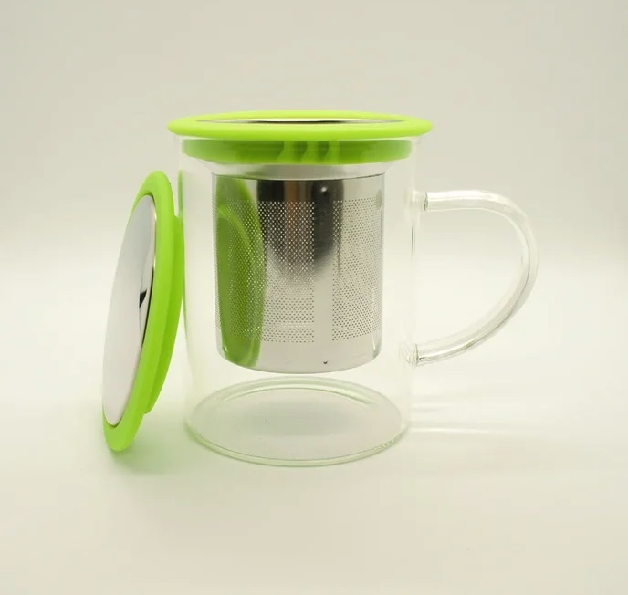 256019 Кружка с металлическим ситом и крышкой, 350 мл, цвет - зеленый, стекло, d=8 см, h=9,5см.
