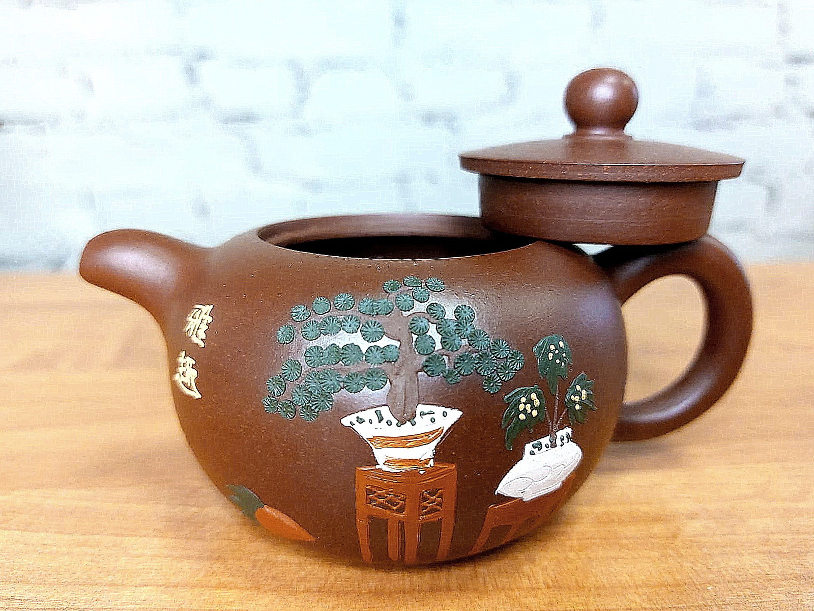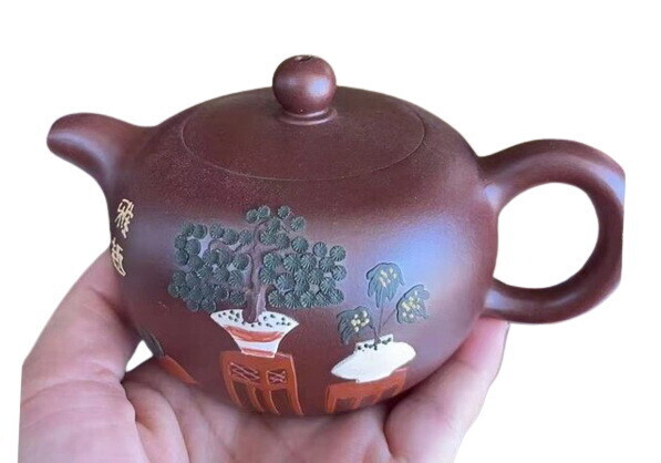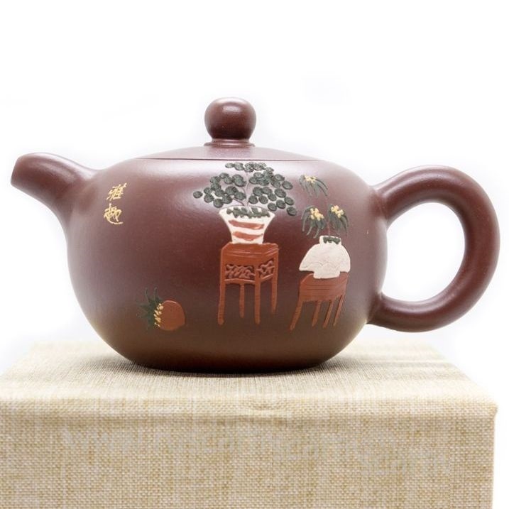 Отличается рисунком, тонко нанесенным слипом вручную на внешней стороне чайника. Слипом называют тонкие раскатанные полоски из разноцветной глины. В традиционном китайском стиле искусно изображены комнатные растения в домашнем интерьере, что добавляет чайнику художественной ценности.