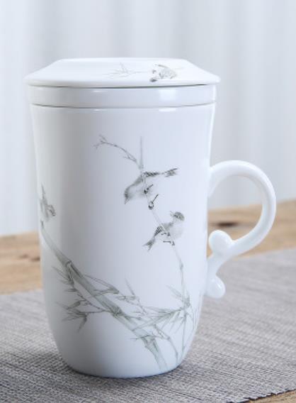 266012 Кружка "Птицы в зарослях бамбука" с заварочной колбой h=12см, d=10,5см, 250мл, керамика белый