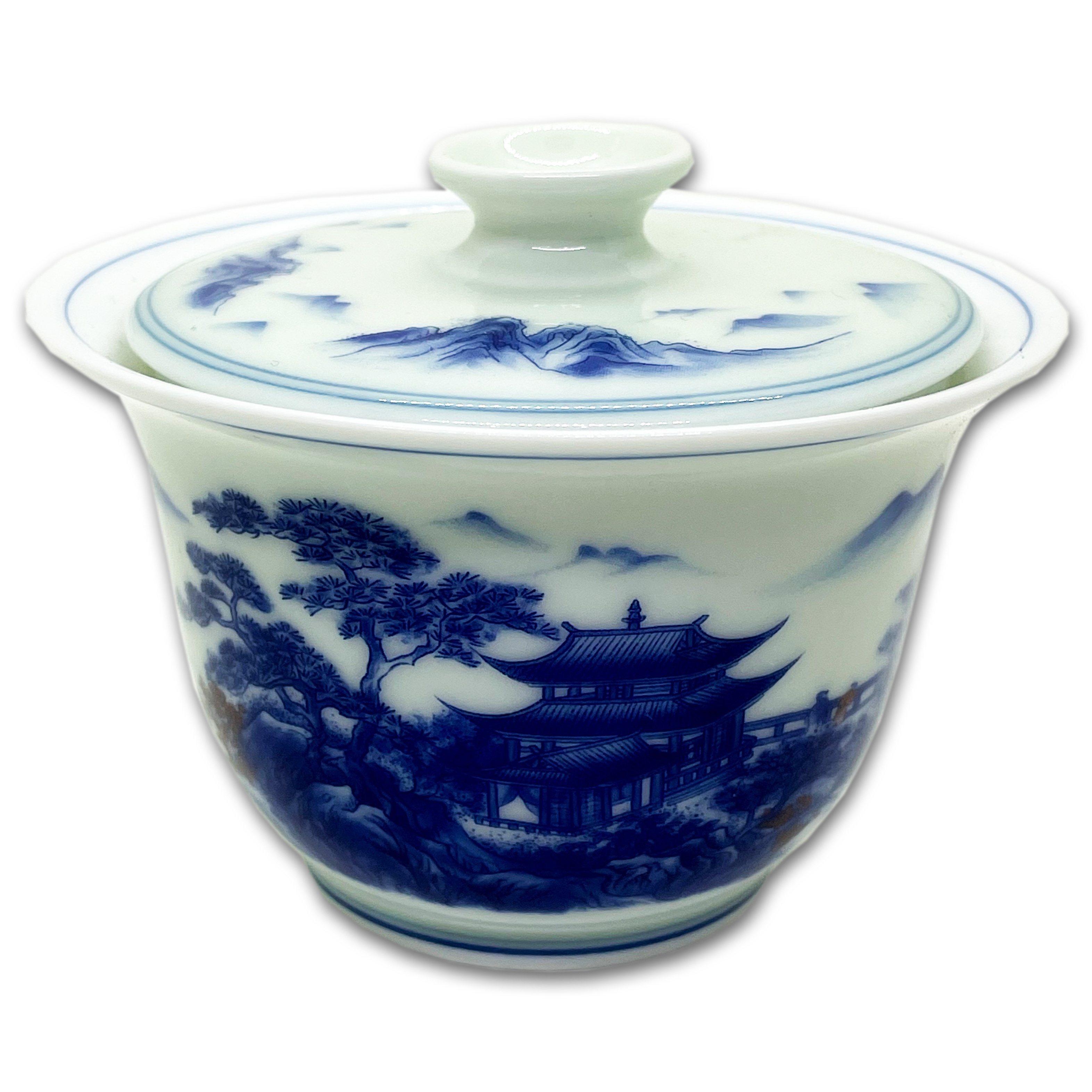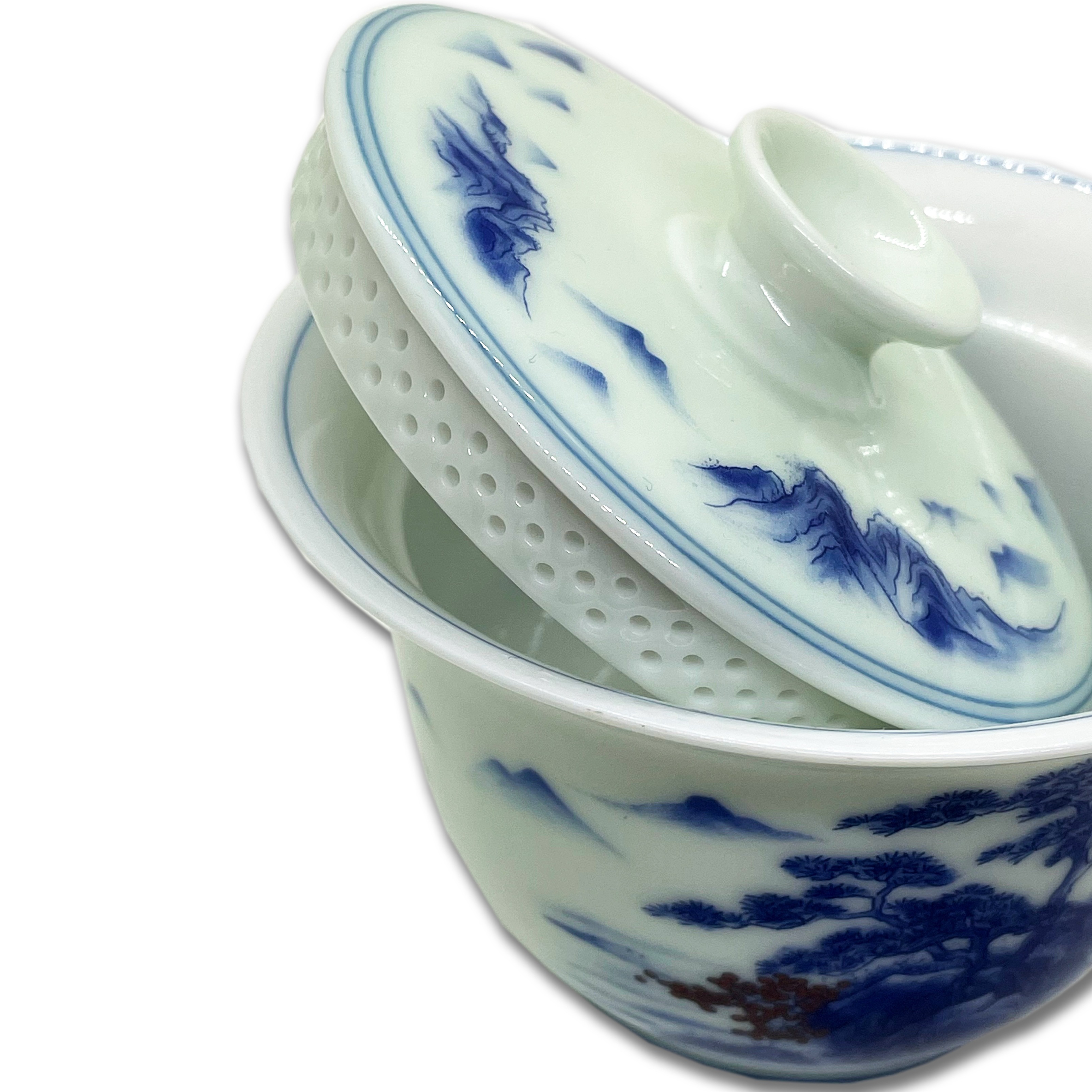 Гайвань выполнена в стиле Цинхуа. Цинхуа (青花瓷) — это известная техника китайской росписи, характеризующаяся синими узорами, нанесёнными на белую фарфоровую поверхность. Этот стиль получил широкое распространение в эпоху династии Мин, но остаётся популярным и по сей день, символизируя традиционное мастерство китайских художников. Изображение пейзажа на чайной посуде является важным элементом китайской символики. Горы в китайской культуре символизируют стабильность, нерушимость и долголетие, а природа и дома на посуде отражают стремление к гармонии с окружающим миром.