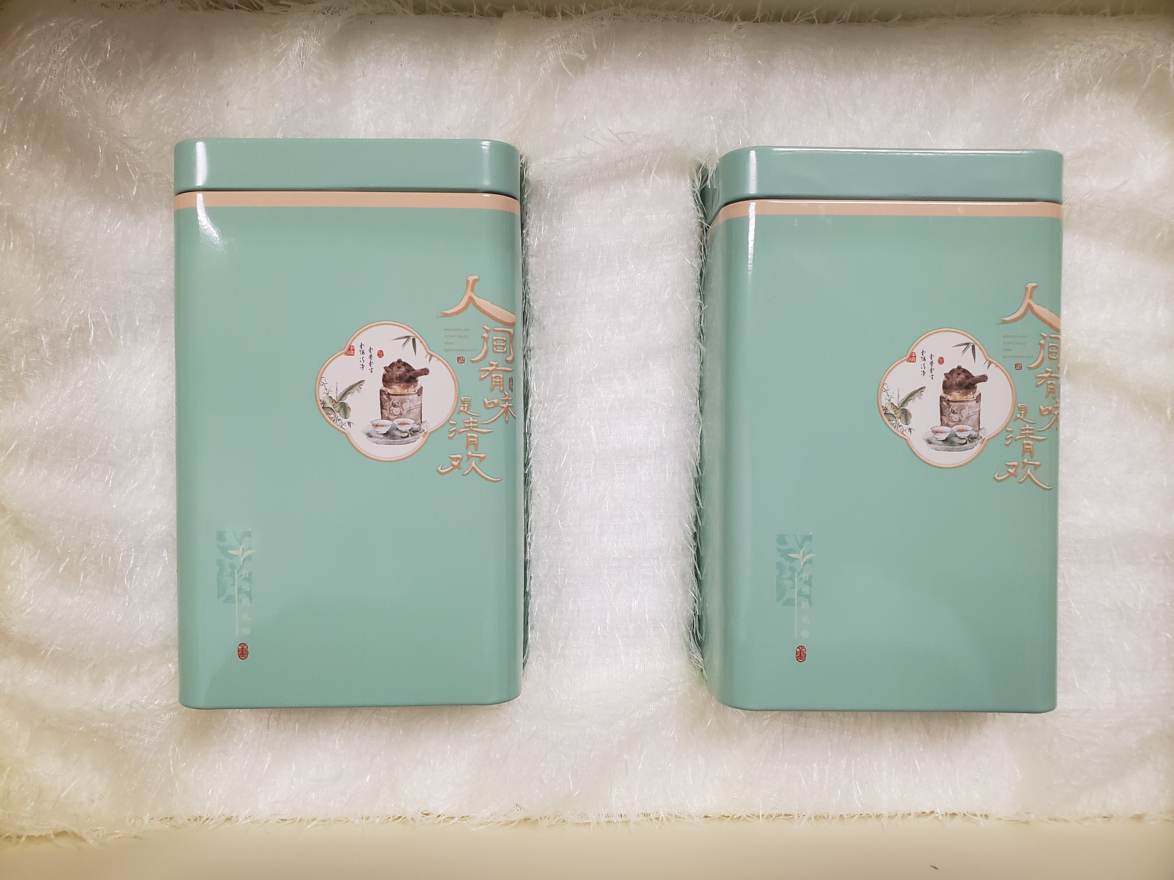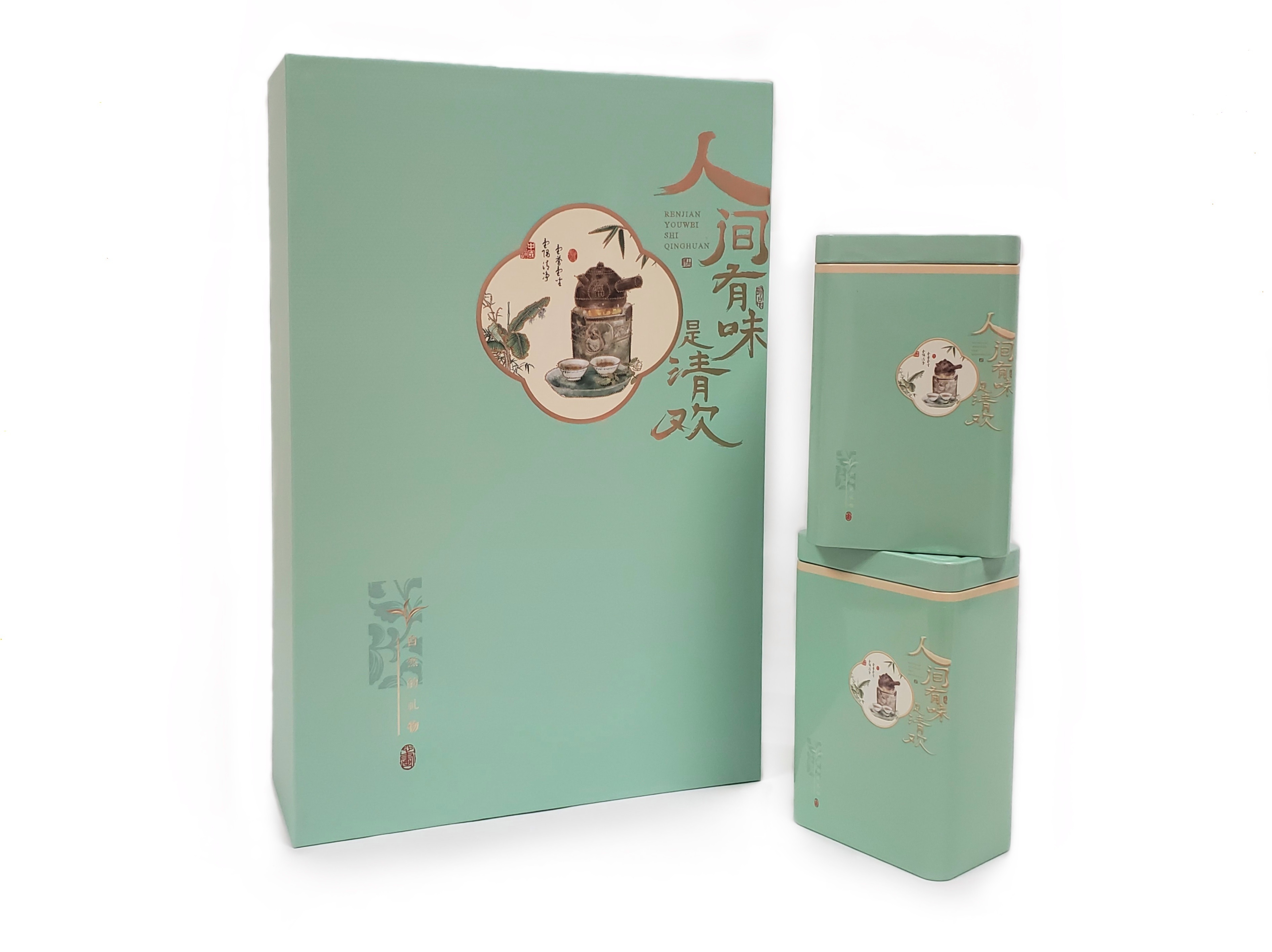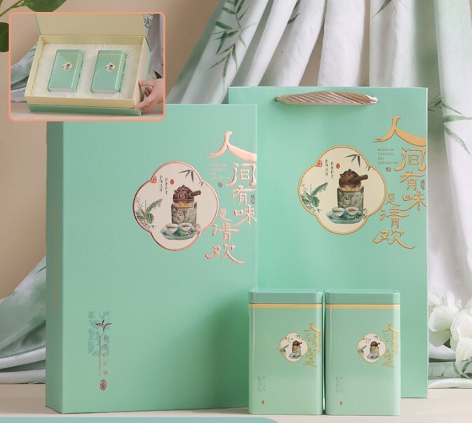 Картон, бумага, жесть. Коробка, сумка, 2 банки. Банка 140*85*60мм.