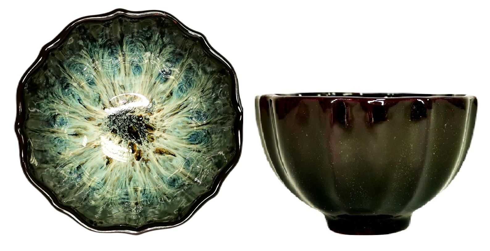 Пиала выполнена в технике Ту хао, что в переводе означает «Заячий ворс». При обжиге оксиды железа, входящие в состав глазури, оплавляются и стекают вниз, образуя тончайшие потеки серебряных, бронзовых или золотистых оттенков. В результате создаются совершенно уникальные рисунки и двух одинаковых пиал просто не может быть. Поверхность пиалы переливается мельчайшими блестками, в совокупности с узором они очень приятны глазу в процессе чаепития и в коллекции на полочке.