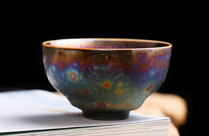• В процессе восстановительного обжига медесодержащая глазурь, растекаясь по поверхности изделия, создает сложные и бесконечно разнообразные сочетания удивительных переливов и оттенков.
