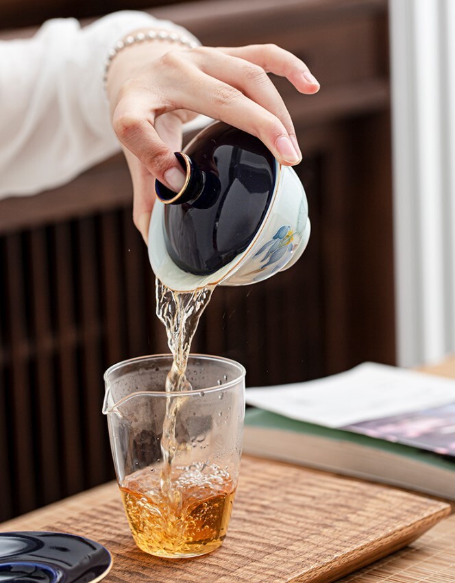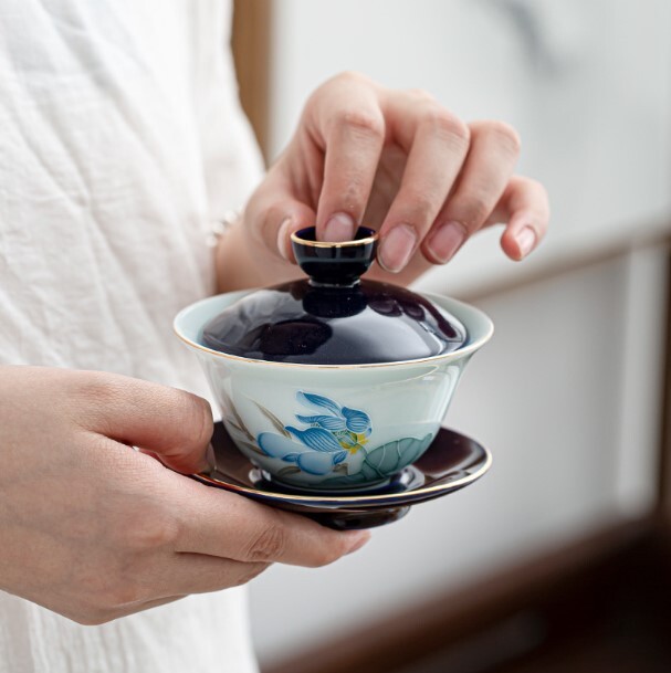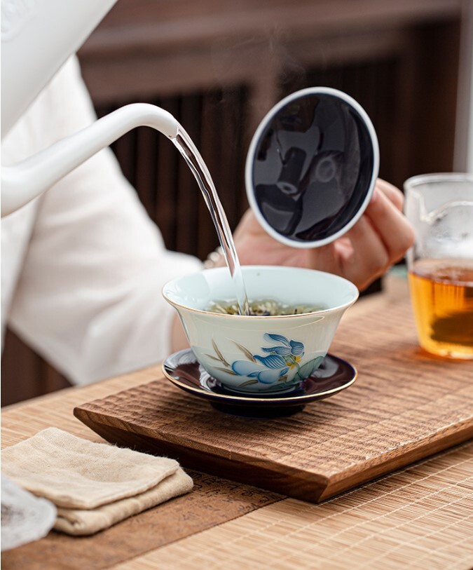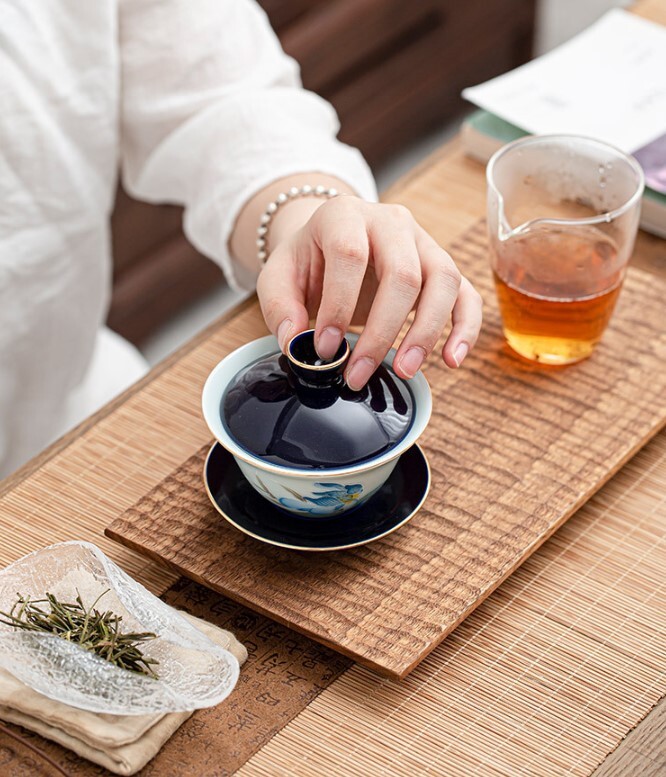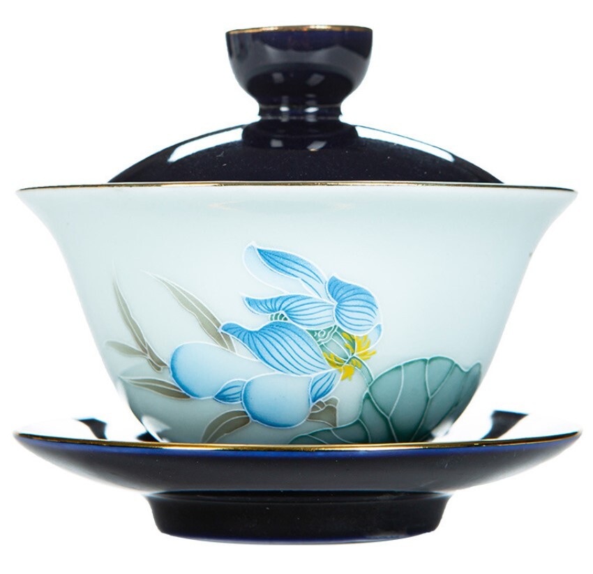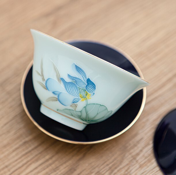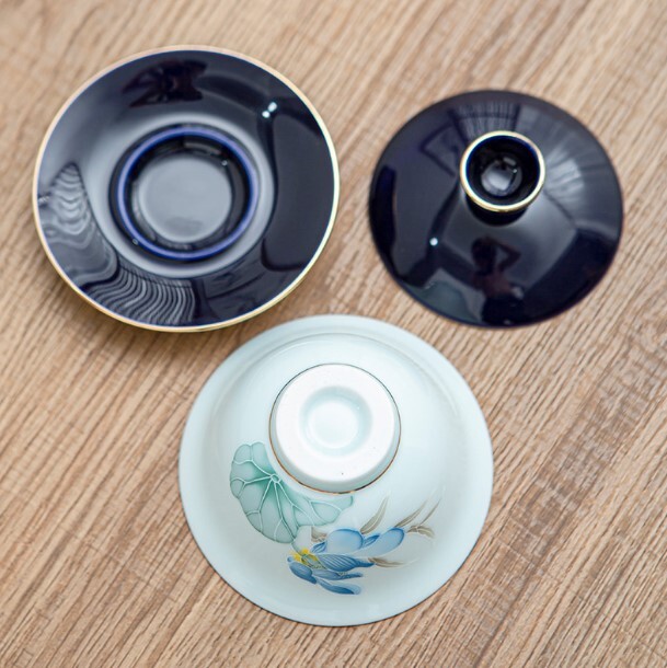 Тонкий фарфор, белый и синий цвета, с рисунком.