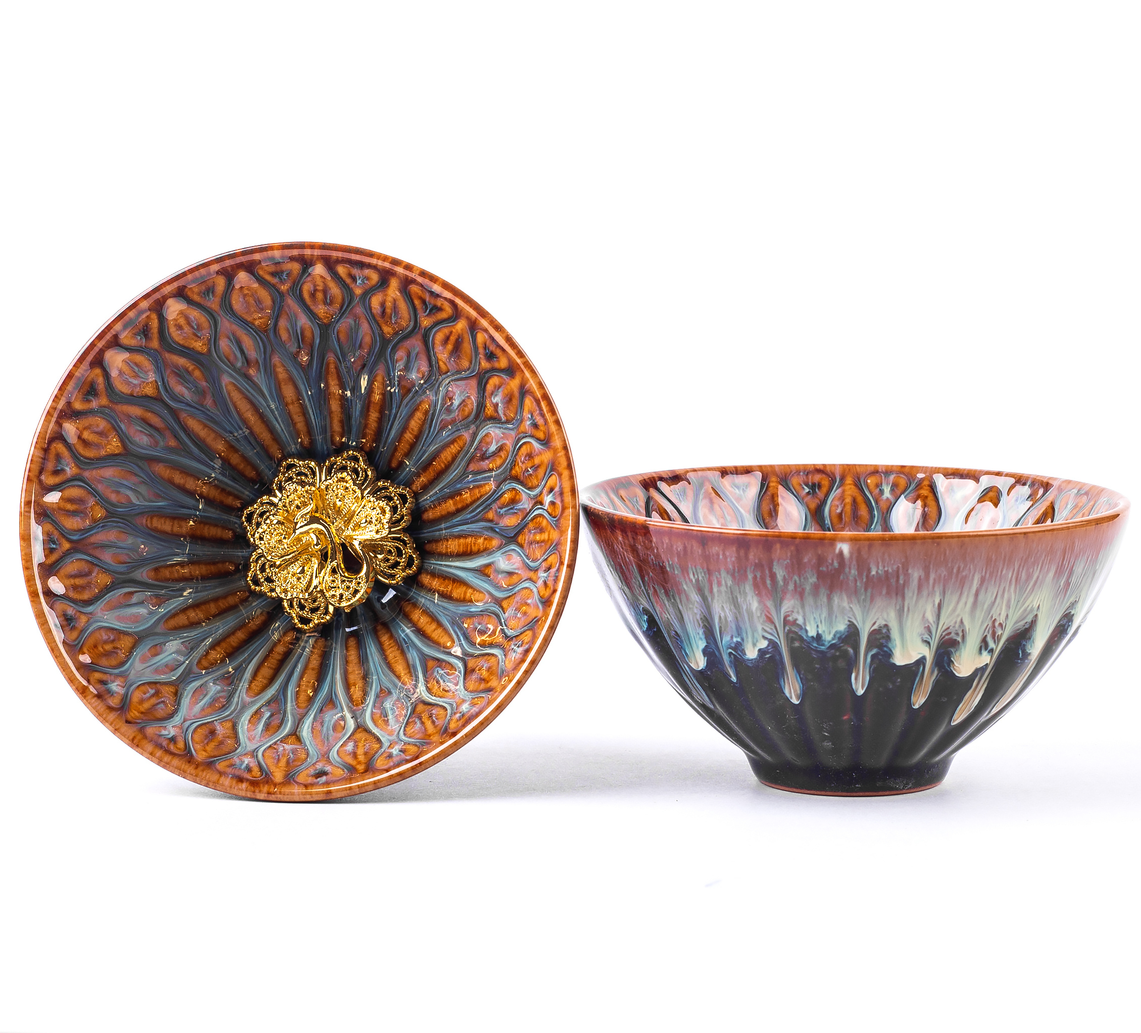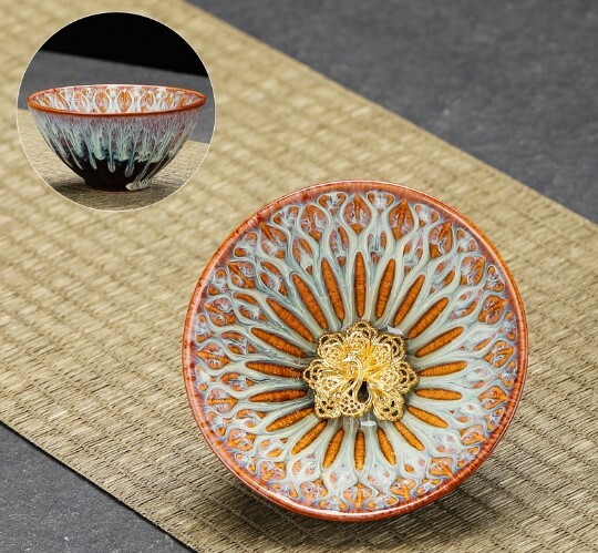 Красная глазурованная керамика + металл. Уникальный стиль, известный своей пятицветной глазурью. Входит в "5-ти знаменитых печей Китая". При нагревании может трескаться прозрачная глазурь.