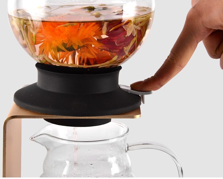 Когда чай готов, достаточно нажать на кнопку верхнего чайник и через двойное сито отфильтрованный настой перельется в нижнюю колбу.