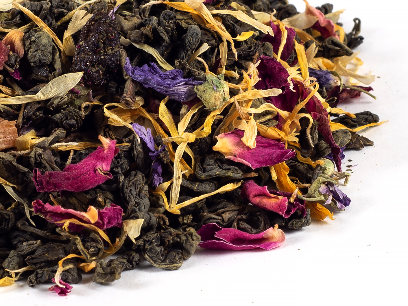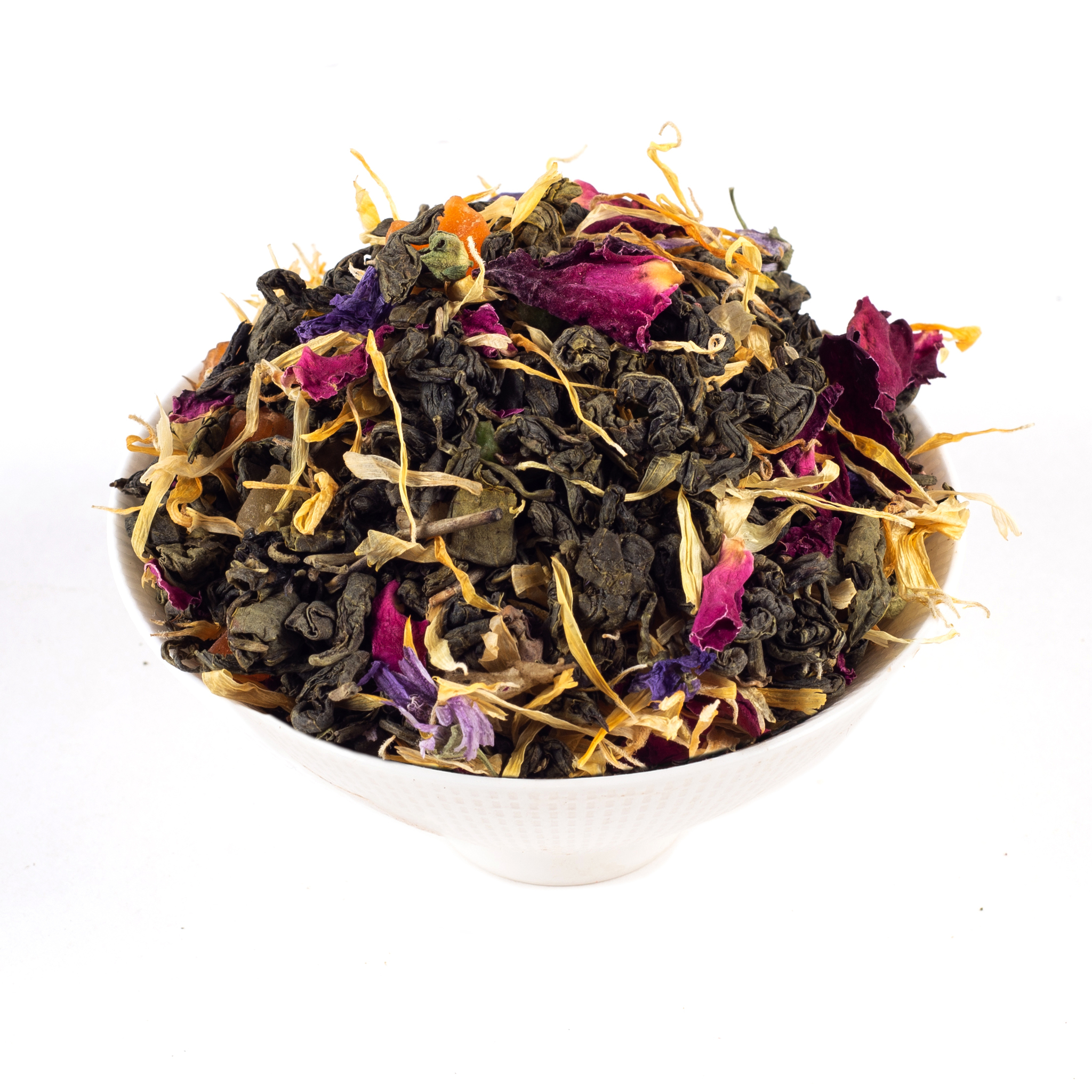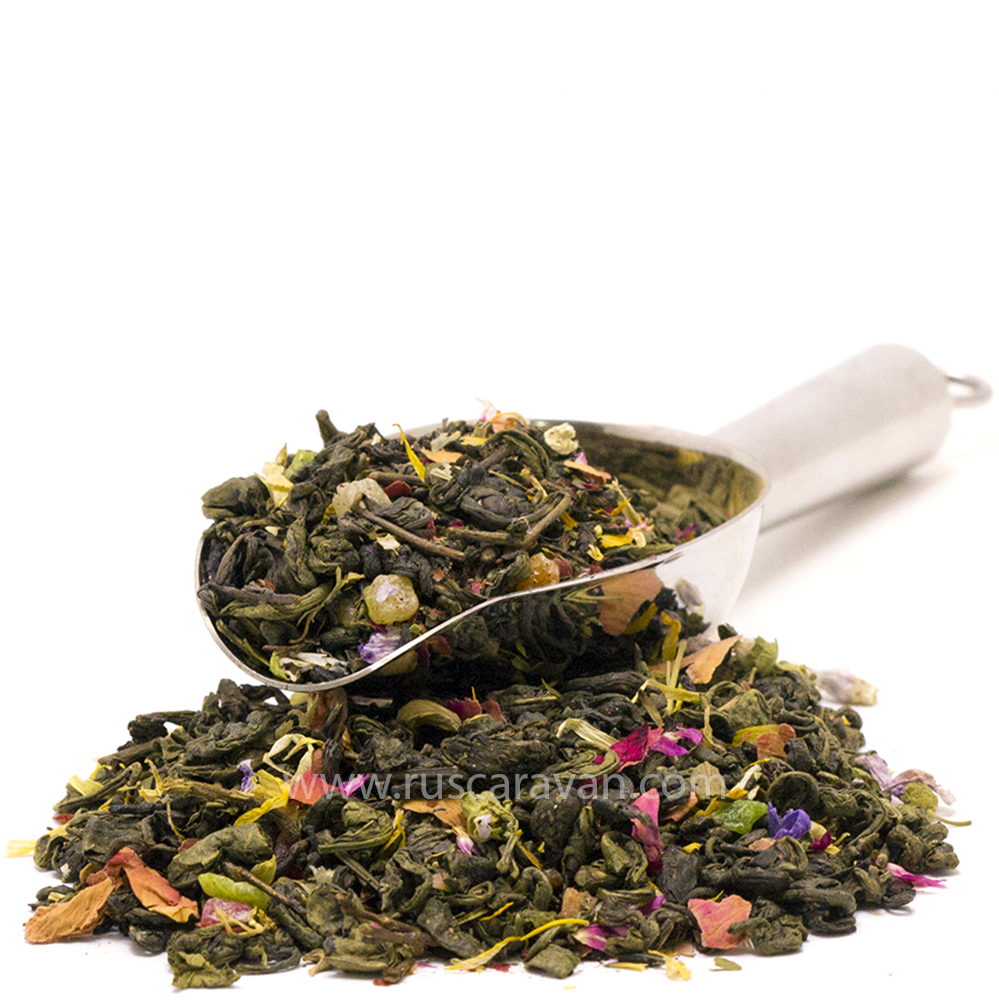 СОСТАВ: Зелёный чай Ганпаудер, цукаты ананаса, изюм, цветки мальвы, лепестки календулы и розы, ароматизатор.