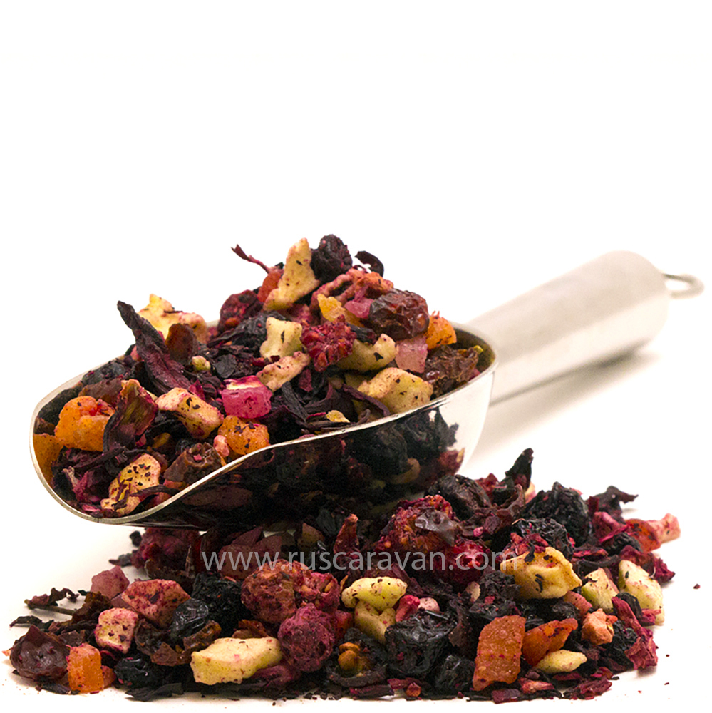 СОСТАВ: Каркаде, изюм, кусочки ананаса, кусочки вишни, малины, яблока, плоды шиповник, с ароматом клубники, малины и лесных ягод.