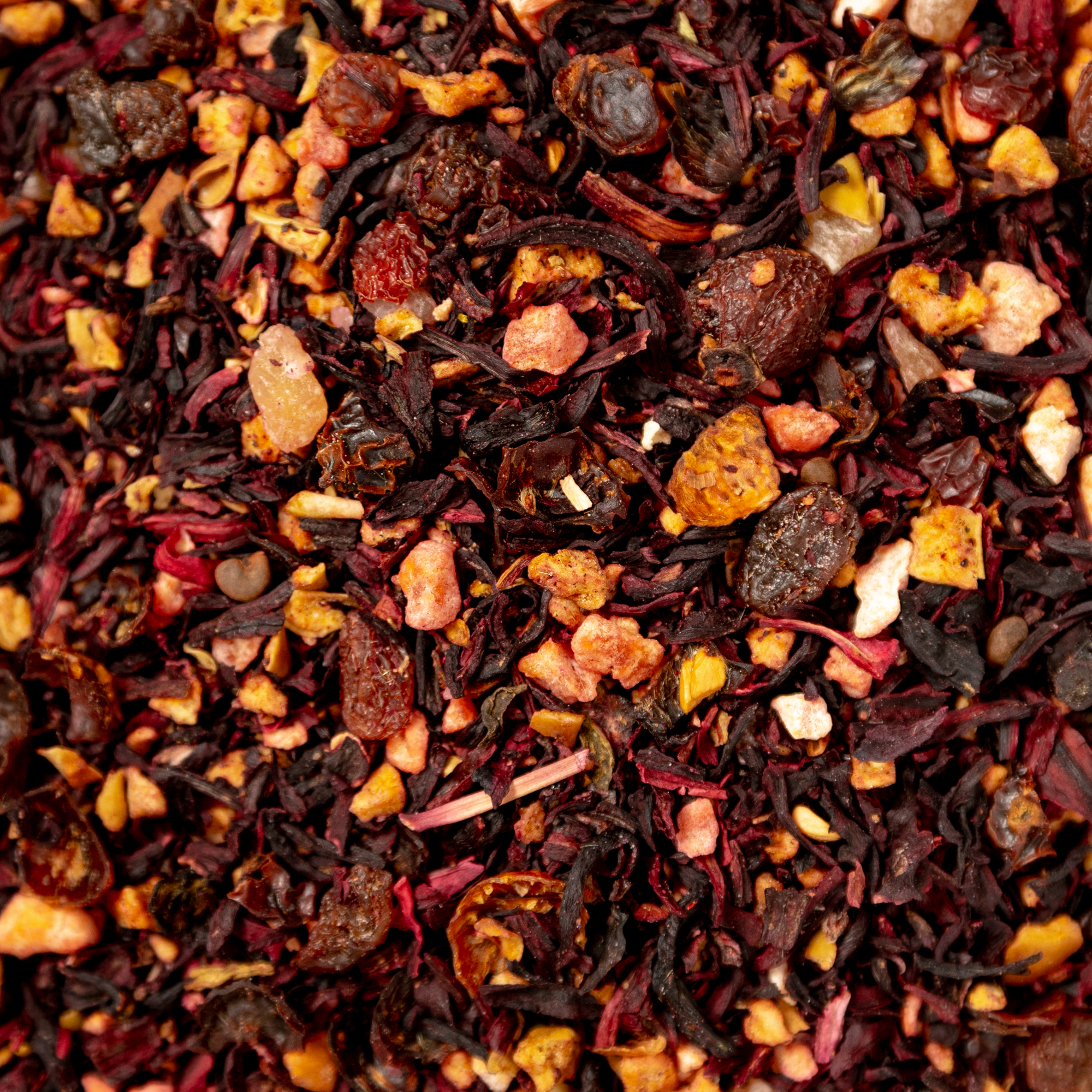 Терпкий напиток пышет витаминной мощью и плодовым разнообразием. Наиболее ярко проявляет себя малина, которой много в аромате и настое, имеющем благодаря основе из цветов гибискуса, интенсивный цвет розы и все той же малины. Вы вполне отчетливо различите и вкус каркаде, и оттенки земляники, и, конечно же, фруктовость. Богатый на впечатления напиток станет мощным подспорьем для вашего иммунитета!