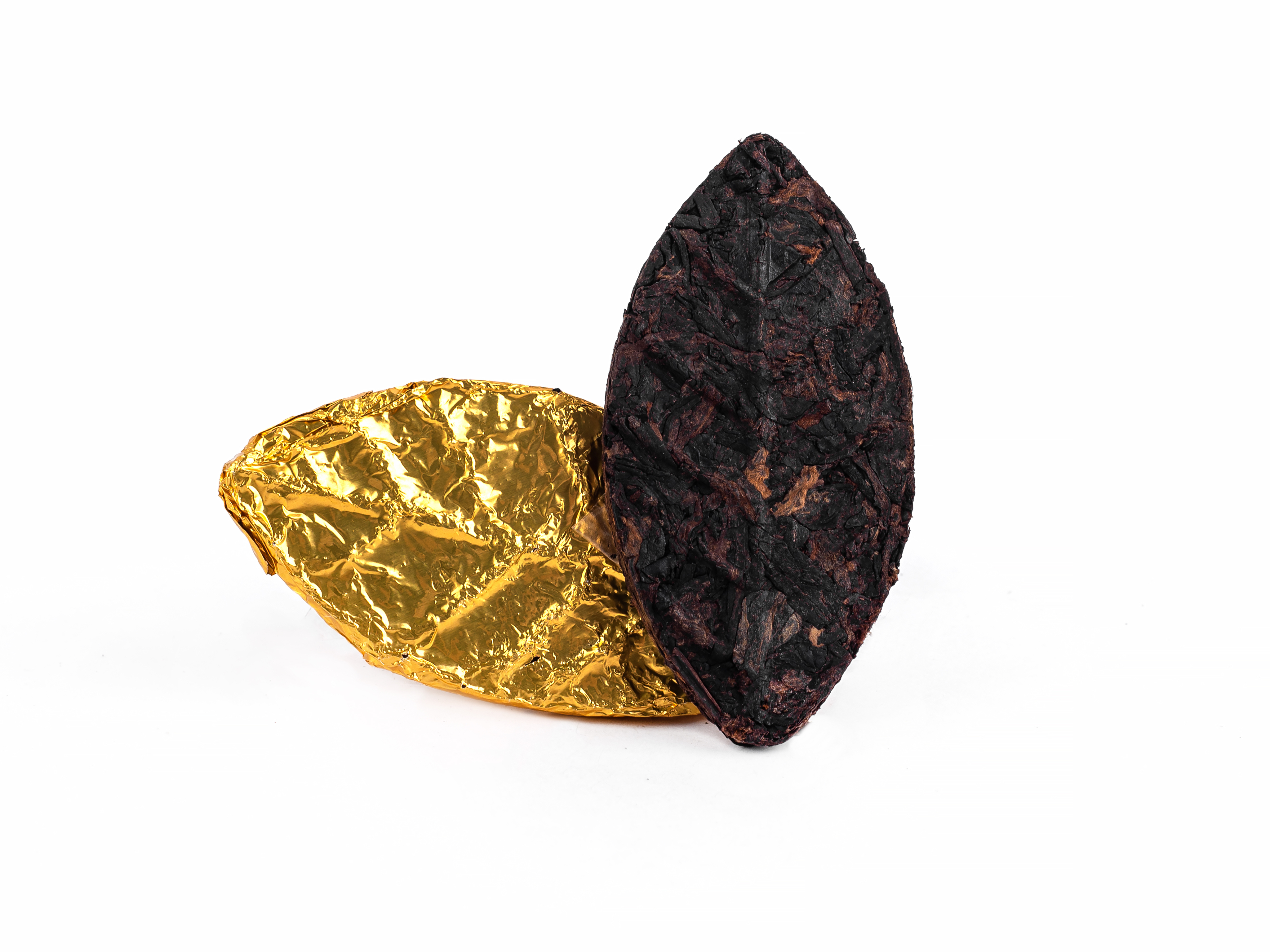 Прессованный шу пуэр в форме чайного листа весом около 7 г.