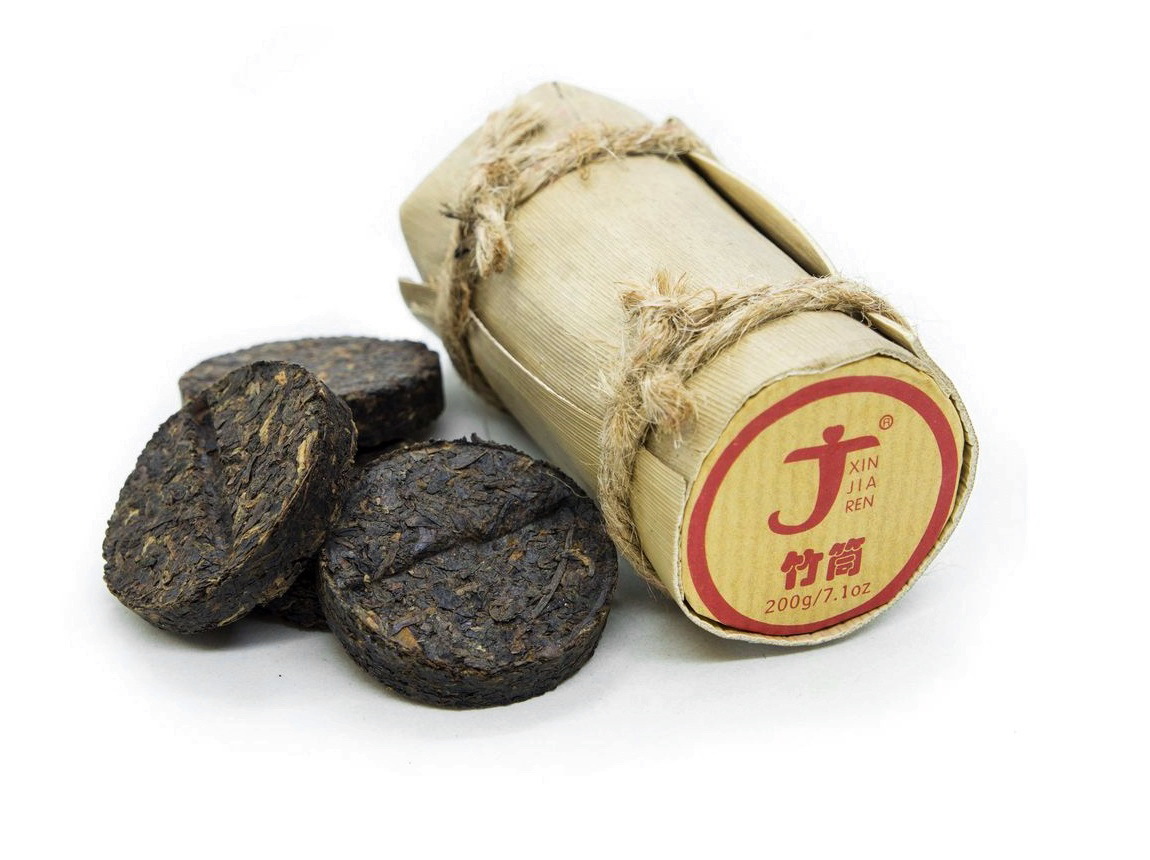Чайная фабрика «Синьцзяжэнь» из китайской провинции Фуцзянь, в первую очередь, известна производством улунских чаев. Но также у нее есть и другие проекты, связанные с юньнаньскими пуэрами. Поэтому пуэр, обернутый в бамбуковый лист и произведенный под своей маркой, тоже считается стандартной продуцией фабрики. 10 таблеток шу пуэра по 10 грамм (общий вес 100 грамм нетто) хорошо и симпатично упакованных в тубус.