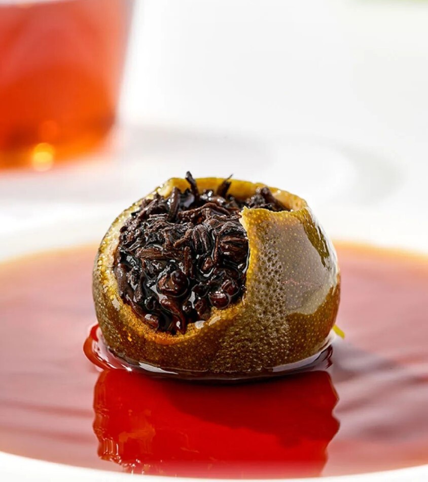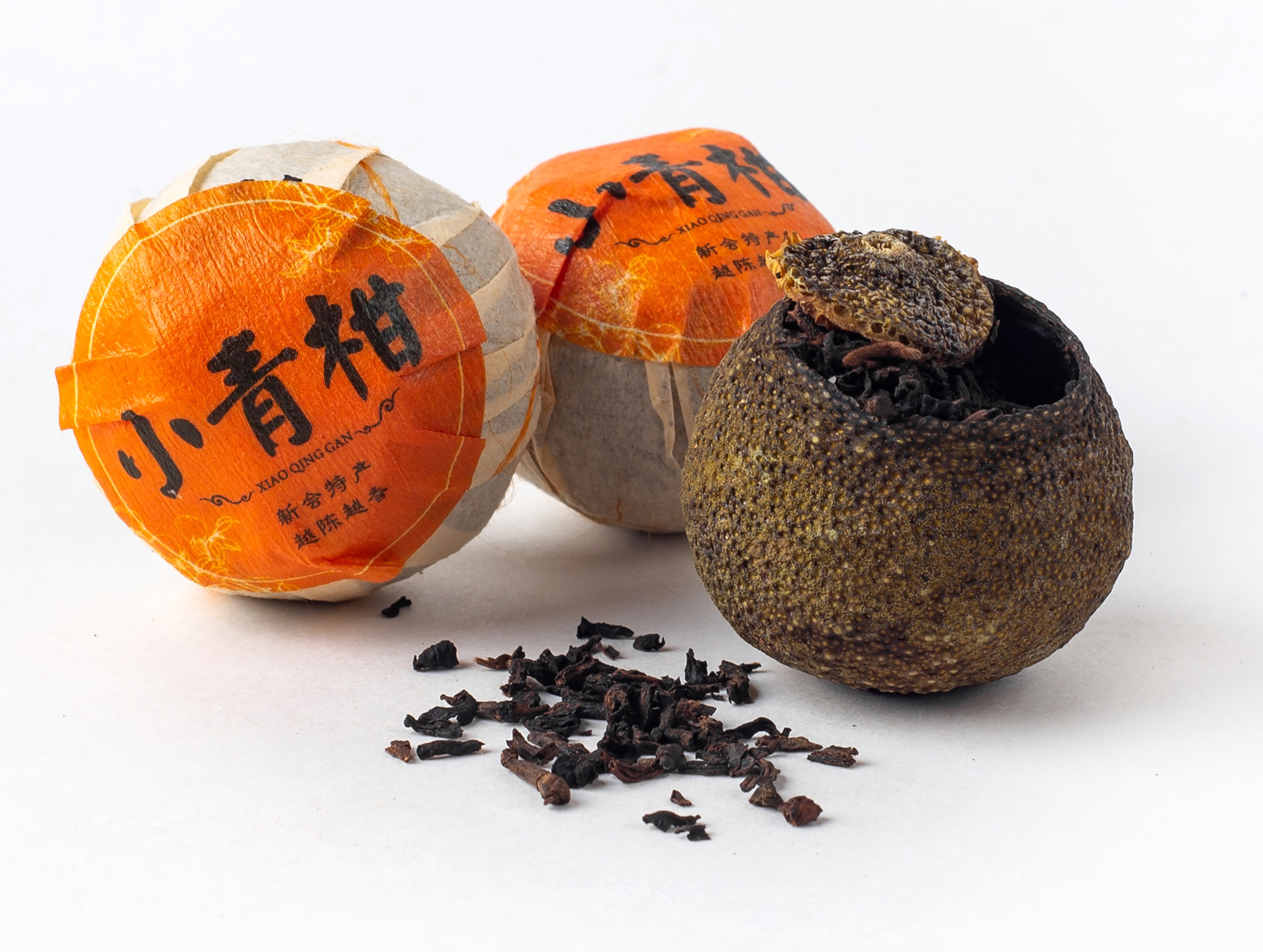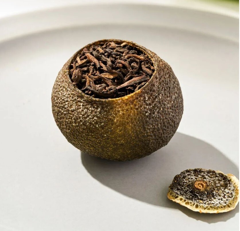 СЫРЬЕ: Рассыпной шу пуэр и мандарин. Из мандарина аккуратно удаляется мякоть и осторожно засыпается чай. После этого его отправляют на сушку, в специальный прожарочный шкаф.