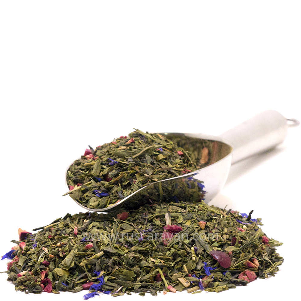 Зеленый чай, кусочки малины и брусники, лепестки василька, мята, ароматизатор
