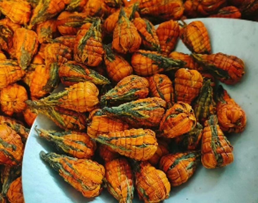 СЫРЬЕ: Отборные чайные листья из провинции Юньнань и цветки лилии, связанные в форме башенок (китайских пагод). Мастера связывают чайные листья хлопчатобумажной или шелковой нитью, затем сушат их при высокой температуре, тем самым сохраняя аромат и вкус. При заваривании распускаются в красивую цветочную композицию.