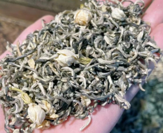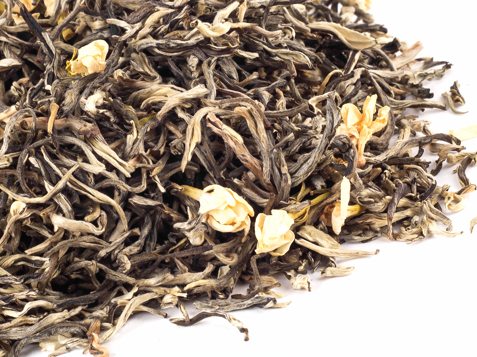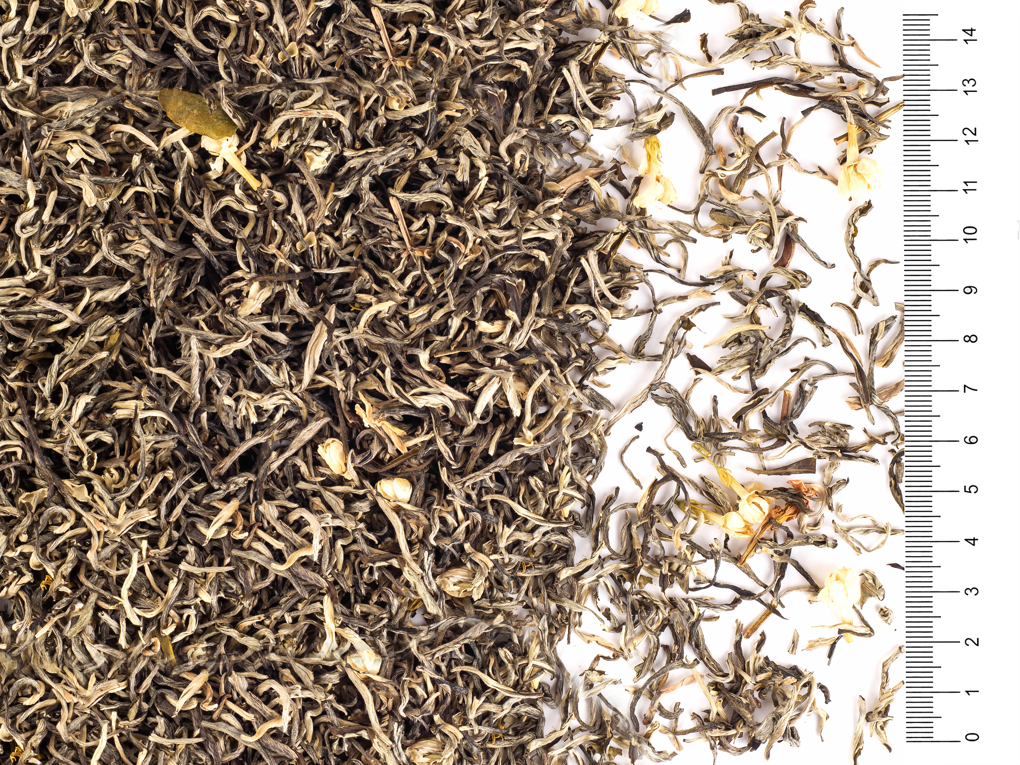 СЫРЬЕ: Длинные тонкие чаинки с большим количеством нежного ворса, с добавлением нежных жасминовых бутонов.
