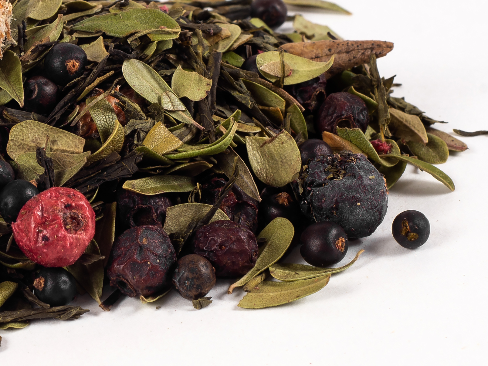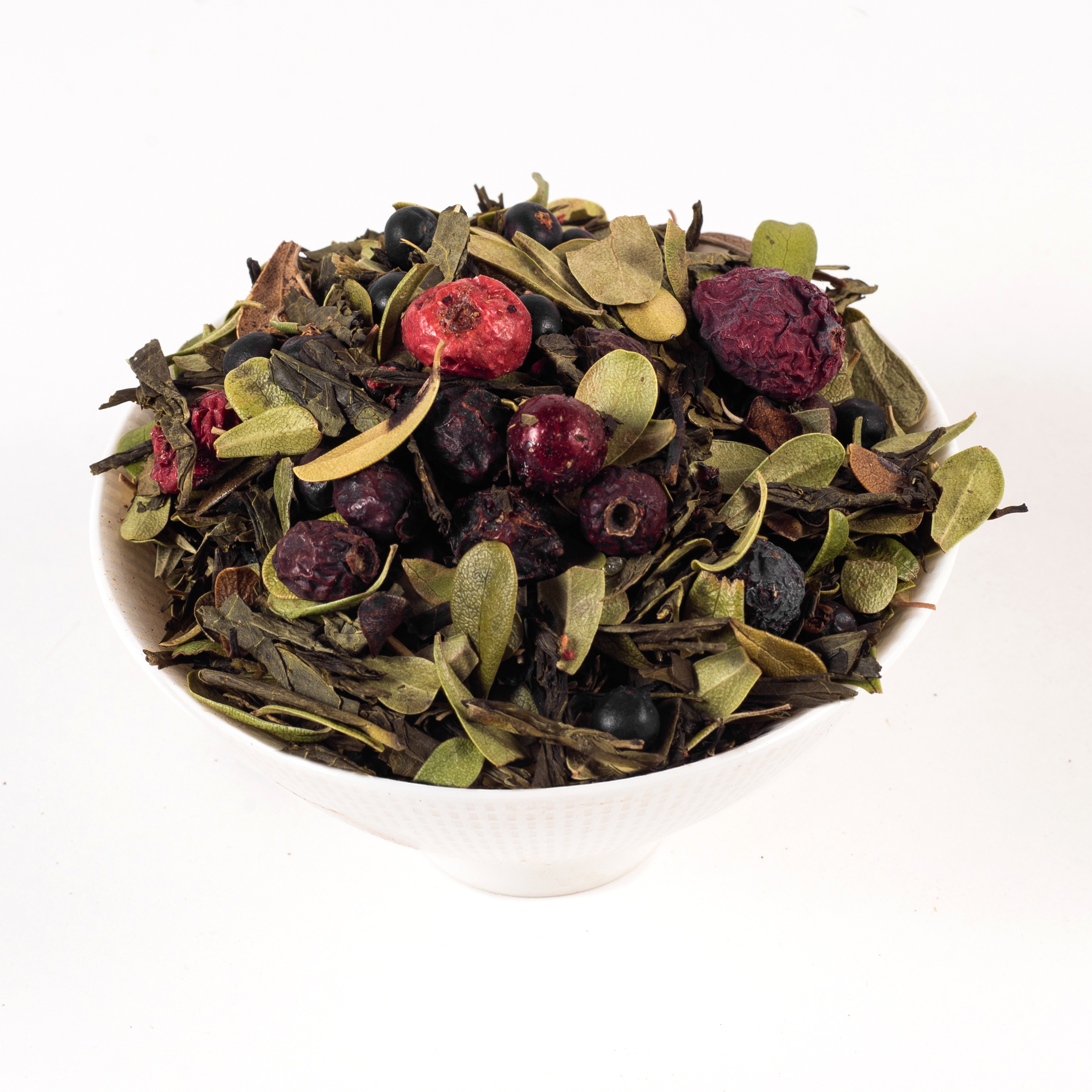 СОСТАВ: Зеленый чай сенча, ягоды клюквы, боярышника, ежевики, красной смородины, можжевельника, малины, лист брусники, сосновые почки, ароматизатор.