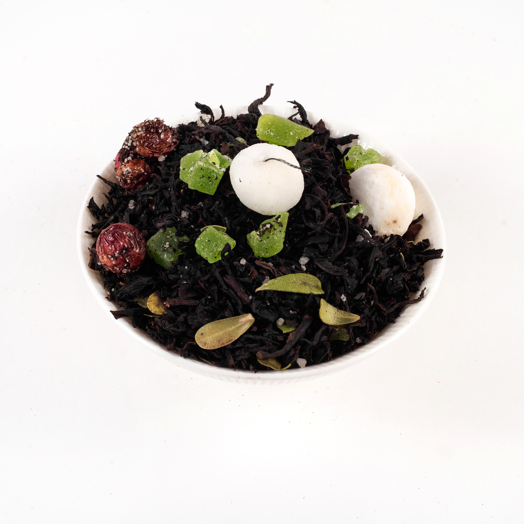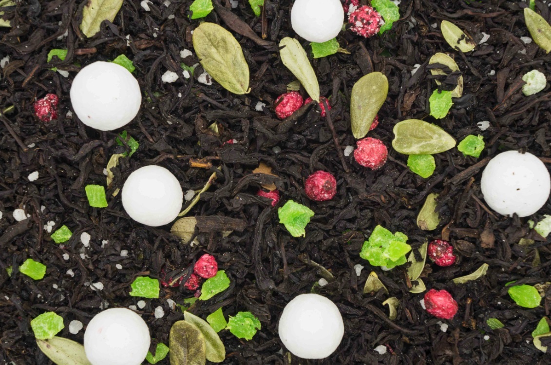 СОСТАВ: Черный индийский чай, клюква в сахарной пудре (та самая), красная смородина, лист брусники, кусочки ананаса, медовые гранулы, с ароматом мяты и барбариса