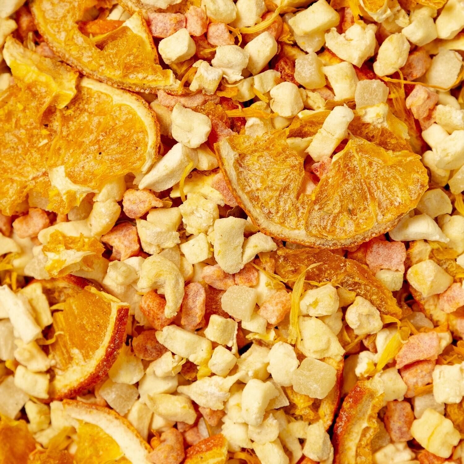 СОСТАВ: Яблоко, кубики ананаса, дольки апельсина, цветки календулы