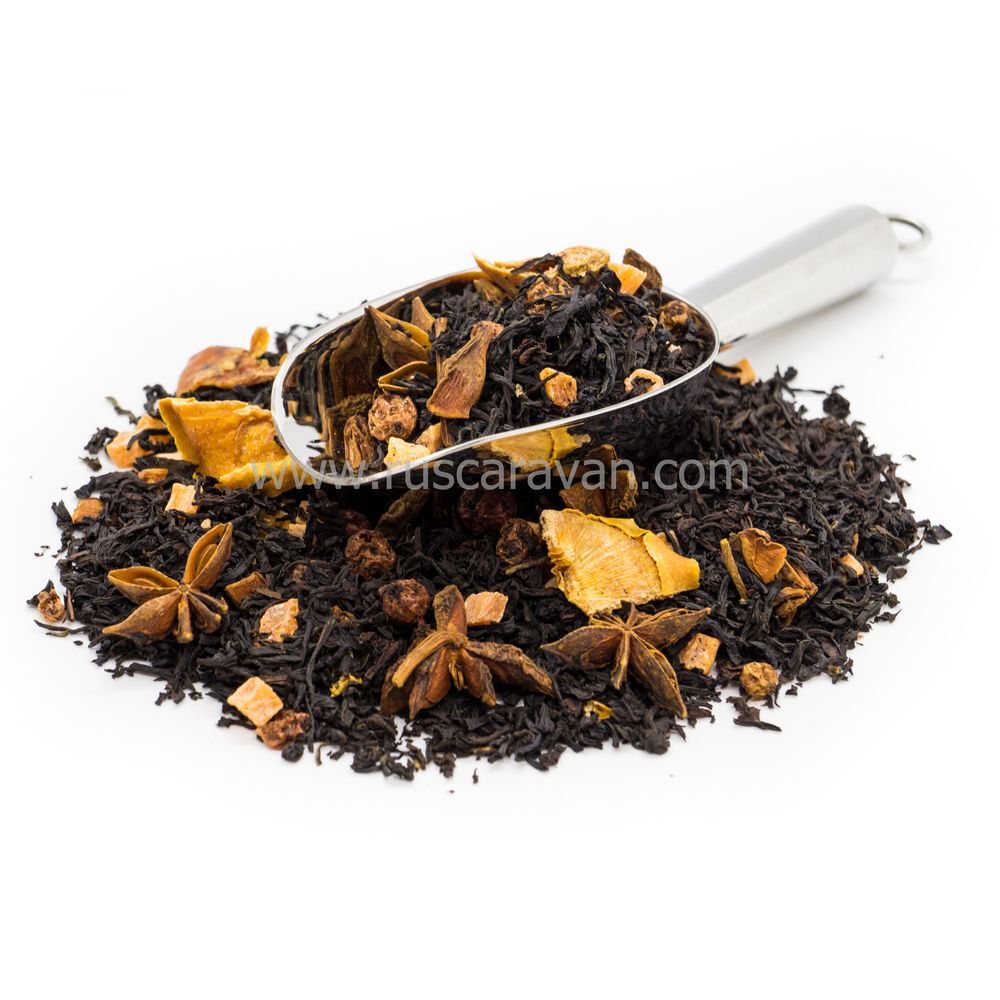 Состав: чай Ассам, чай улун Да Хун Пао высокосортный, бадьян, ананас цукат оранжевый, хурма чипсы, красная смородина, ароматизатор