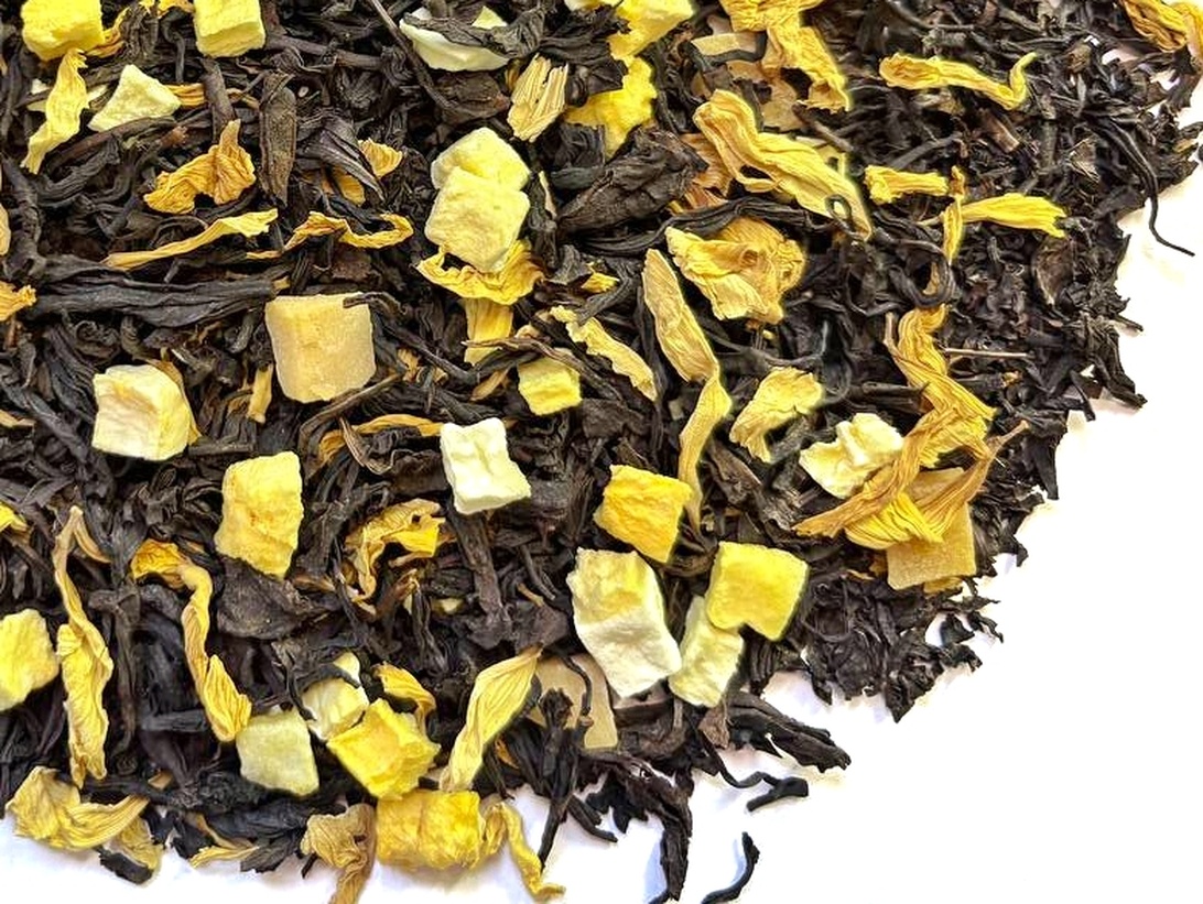 Состав: основа 50% чай черный Ассам, 50% чай красный Чаньнин Дяньхун. Манго цукаты, манго сублимат, лепестки подсолнечника, с ароматом манго.