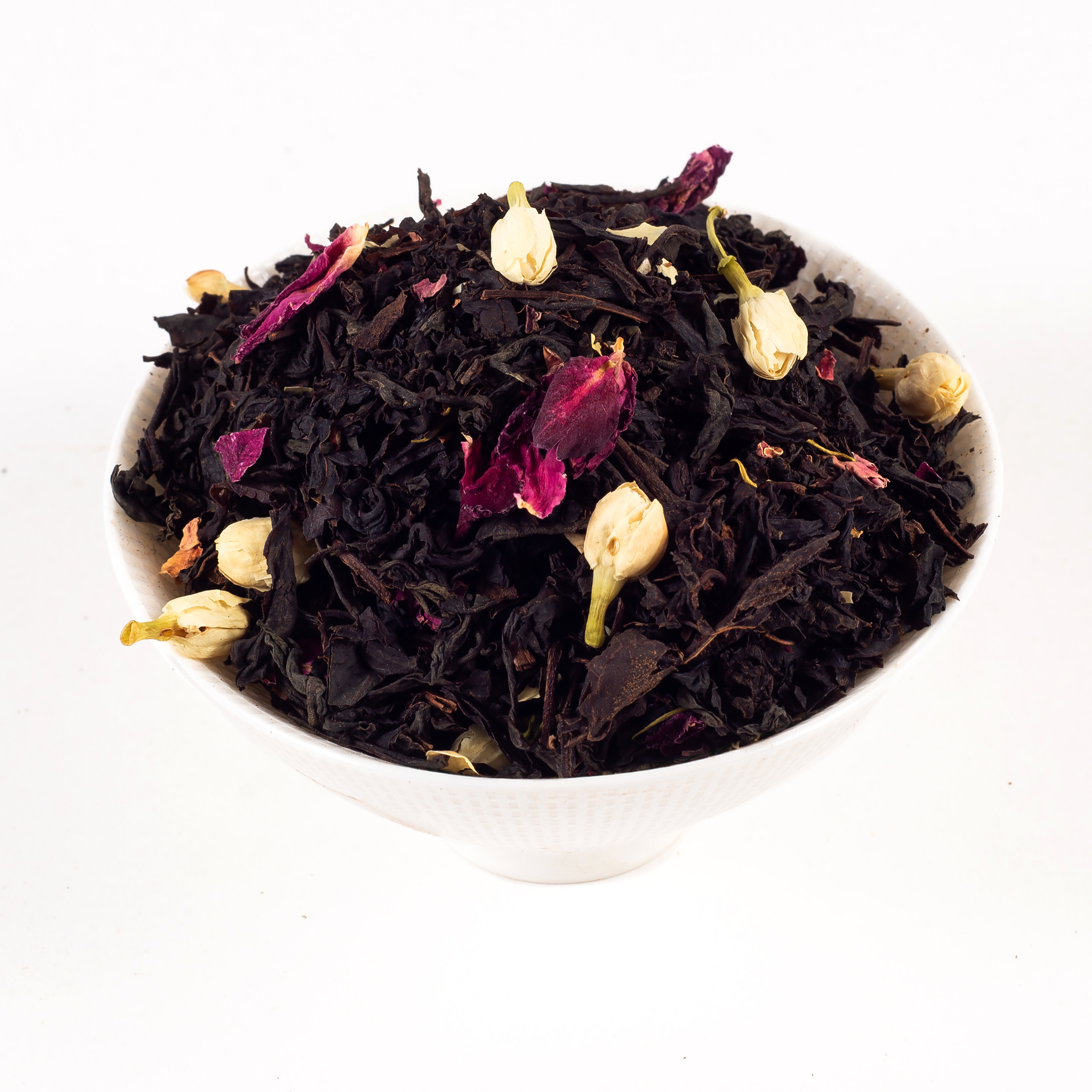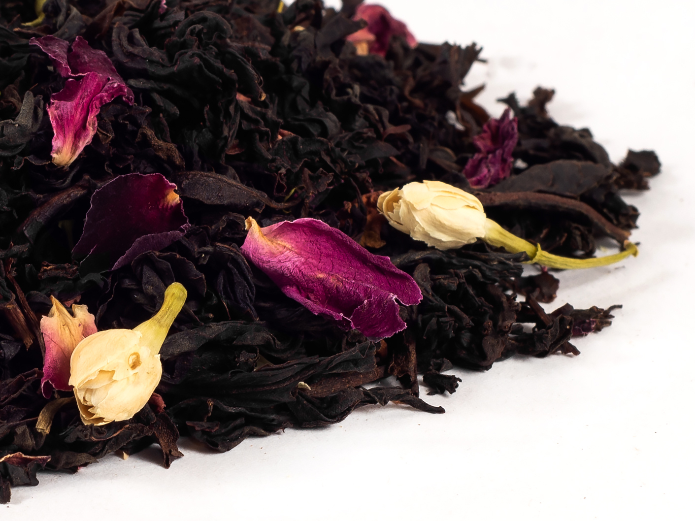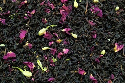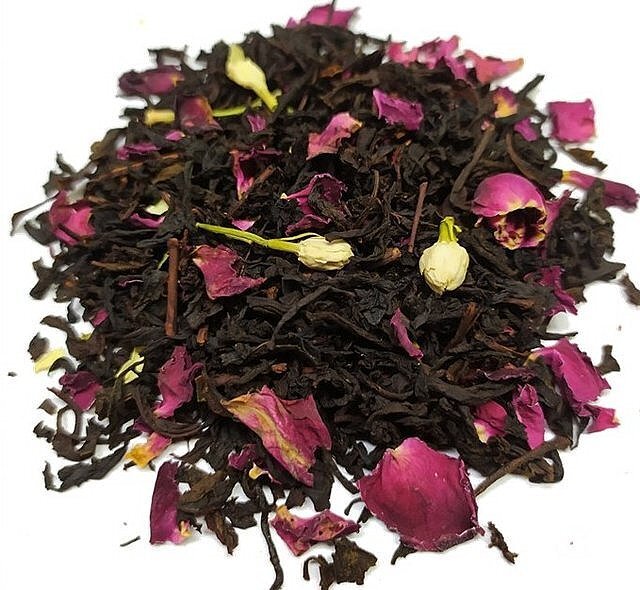 Чёрный чай «Бурбонская роза» – изысканный букет из крепкого индийского чая, лепестков розы и бутонов жасмина с благородными нотами бергамота и лайма.