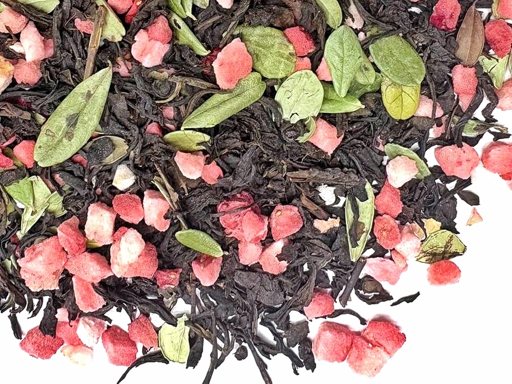 Состав: чай черный Ассам, чай красный Чаньнин Дяньхун, медовые гранулы подсолнечник и клубника, брусничный лист, клубника сублимированная кусочки, с ароматом клубники со сливками.