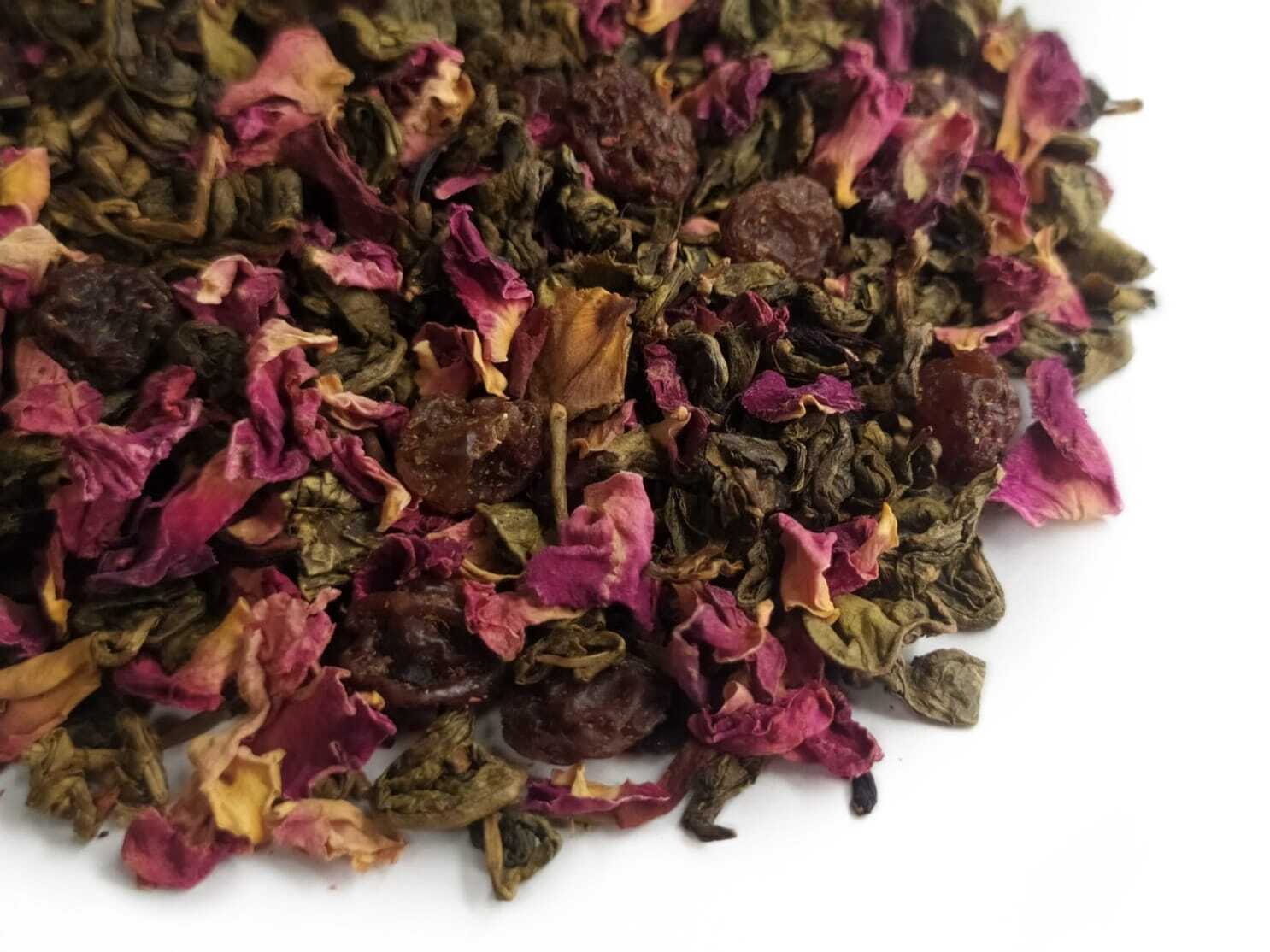 СОСТАВ: Зеленый чай Ганпаудер, виноград сушеный, гибискус, лепестки розы, ароматизатор.