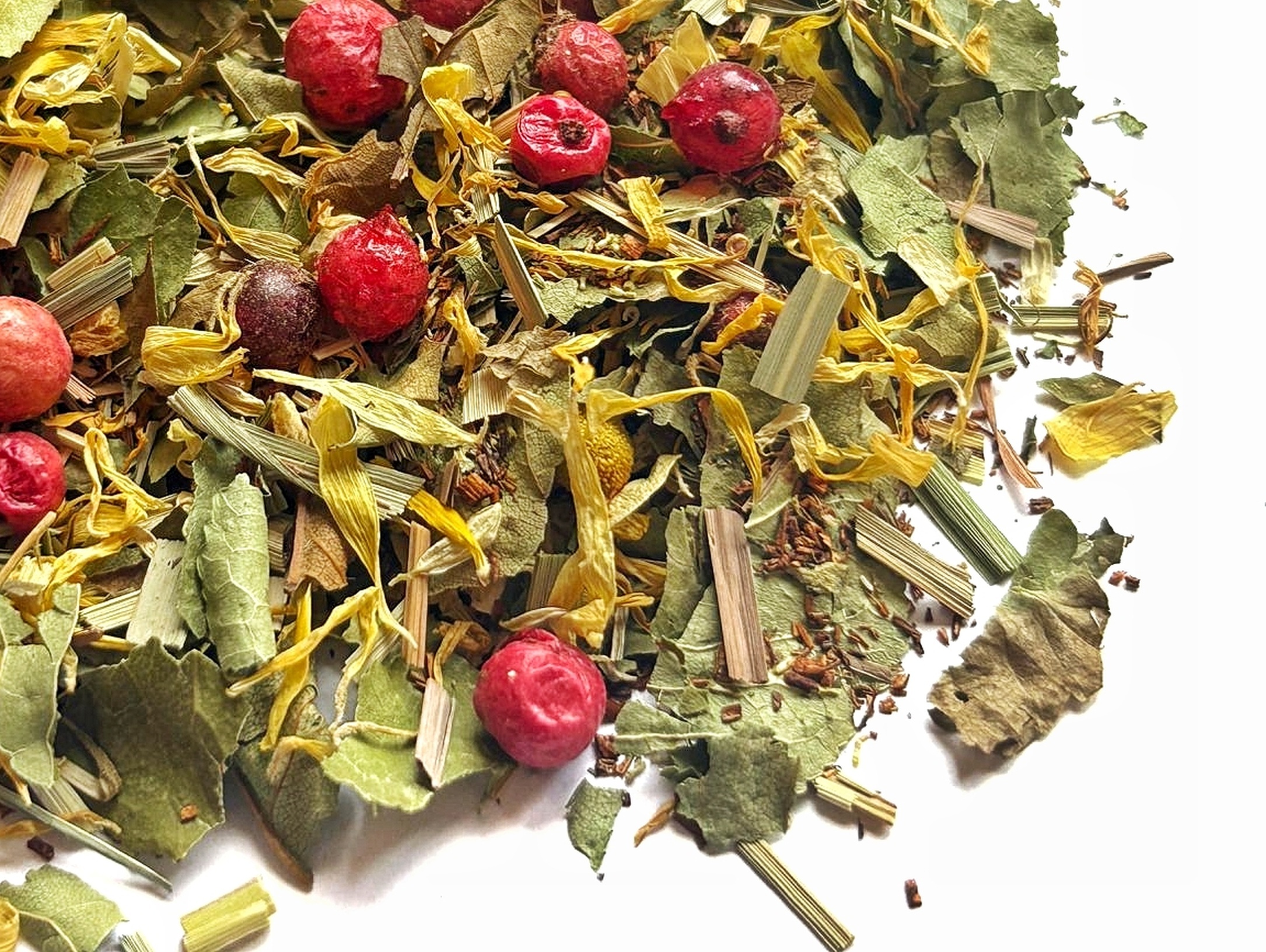 100% натуральный купаж, без ароматизаторов. Состав: Ройбос, лимонная трава, календула, ромашка, лист вишни, красная смородина, корка лимона, мята.
